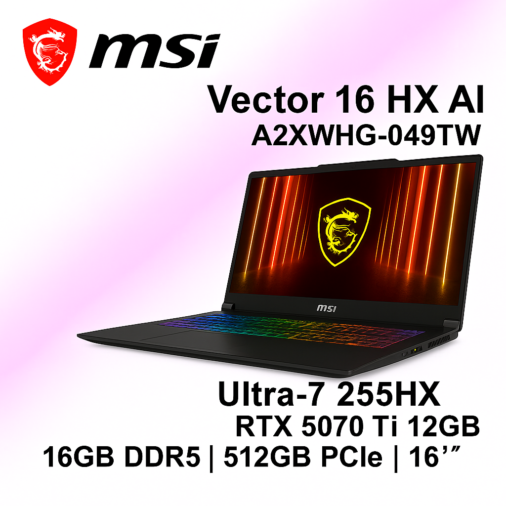 MSI Vector 16 HX AI A2XWHG-049TW 微星滿血版AI電競筆電/Ultra 7-255HX/RTX5070Ti 12G/16GB DDR5/512GB PCIe/16吋 16:10 FHD+ 144Hz/W11/SS單鍵RGB背光電競鍵盤+Copilot Key🎈送保護套/滑鼠墊/鍵盤膜🎈
