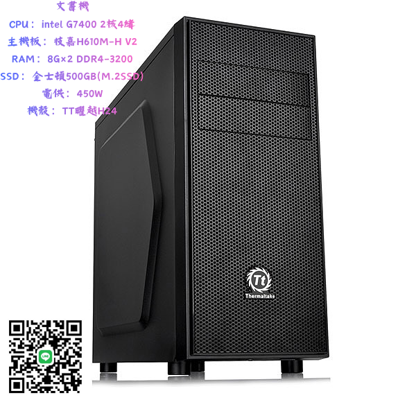 CPU:intel G7400 2核4緒 主機板:技嘉H610M-H V2 RAM:8G×2 DDR4-3200 SSD:金士頓500GB(M.2SSD) 電供:450W 機殼:TT曜越H24 再贈宏晉鍵盤/宏晉滑鼠 因近期價格浮動不定,詳細還請+Line詢問 Line:hungfu211