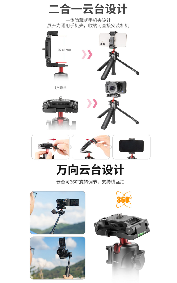 ✔ 二合一雲台設計,一體隱藏式手機夾設計,展開後為通用手機夾,收納可以直接安裝相機。