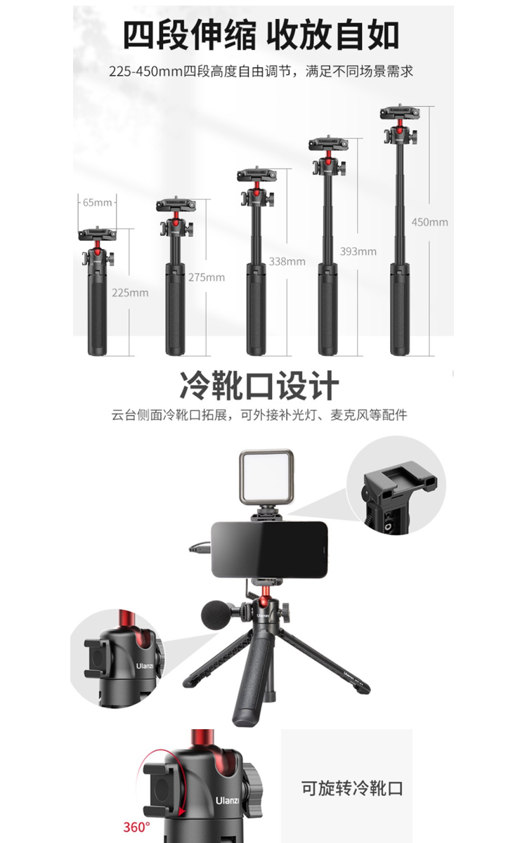 ✔ 折疊手機夾設計,四段高度調節,萬向雲台