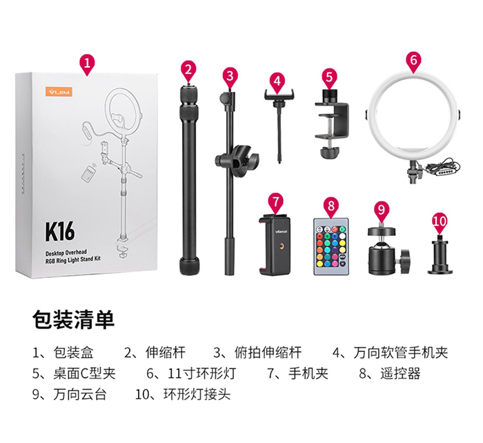 ■標準配件:VIJIM K16 RGB 桌面俯拍LED環形燈套組*1(以官網為準)