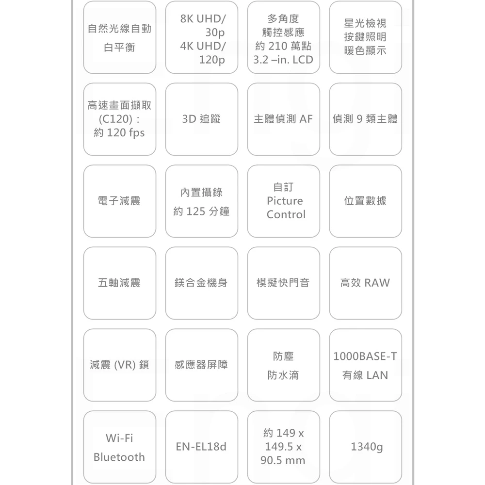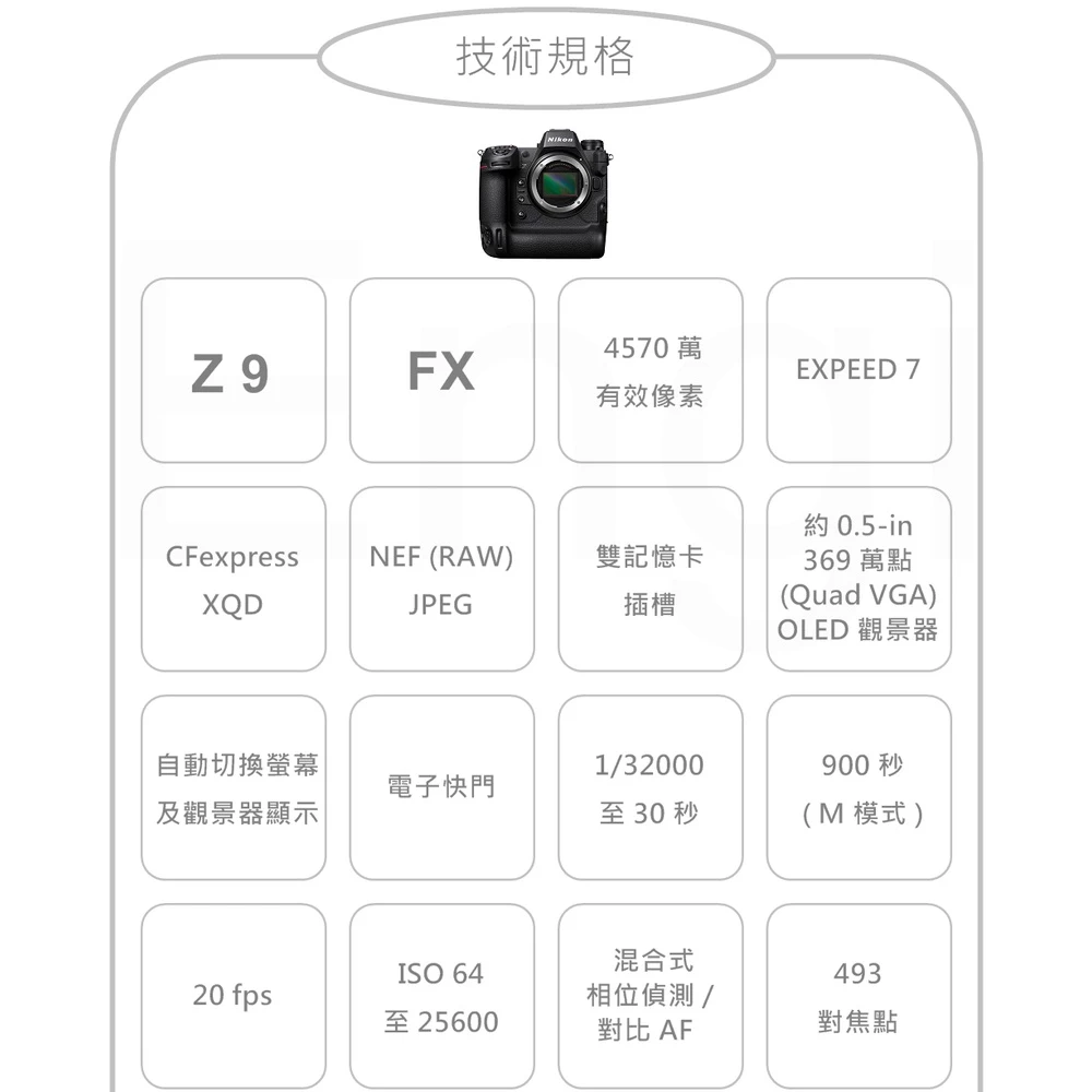 攝影界驚臨巨變!Nikon公司 (Nikon) 隆重推出革命性 Z 系全片幅(Nikon FX 格式)無反相機 Z 9!性能無與倫比,功能突破現況,在 Nikon 旗下以至無反相機界別均屬首創,遠超用家預期。 Z 9 全面提升拍攝能力,讓專業攝影師輕鬆捕捉靜態影像及影片,其配備了 Nikon 首款 4 軸垂直及水平翻揭式螢幕,配搭一體式直度手柄,即使面對最惡劣條件,拍攝依然舒適。此外,Z 9 的自動對焦 (AF) 系統功能強大,可同步偵測的主體類型,真實實時觀景器更不受黑屏影響;相機可內錄長達 125 分鐘 8K 影片,以上一切皆令 Z 9 成為最實用的外景拍攝相機。