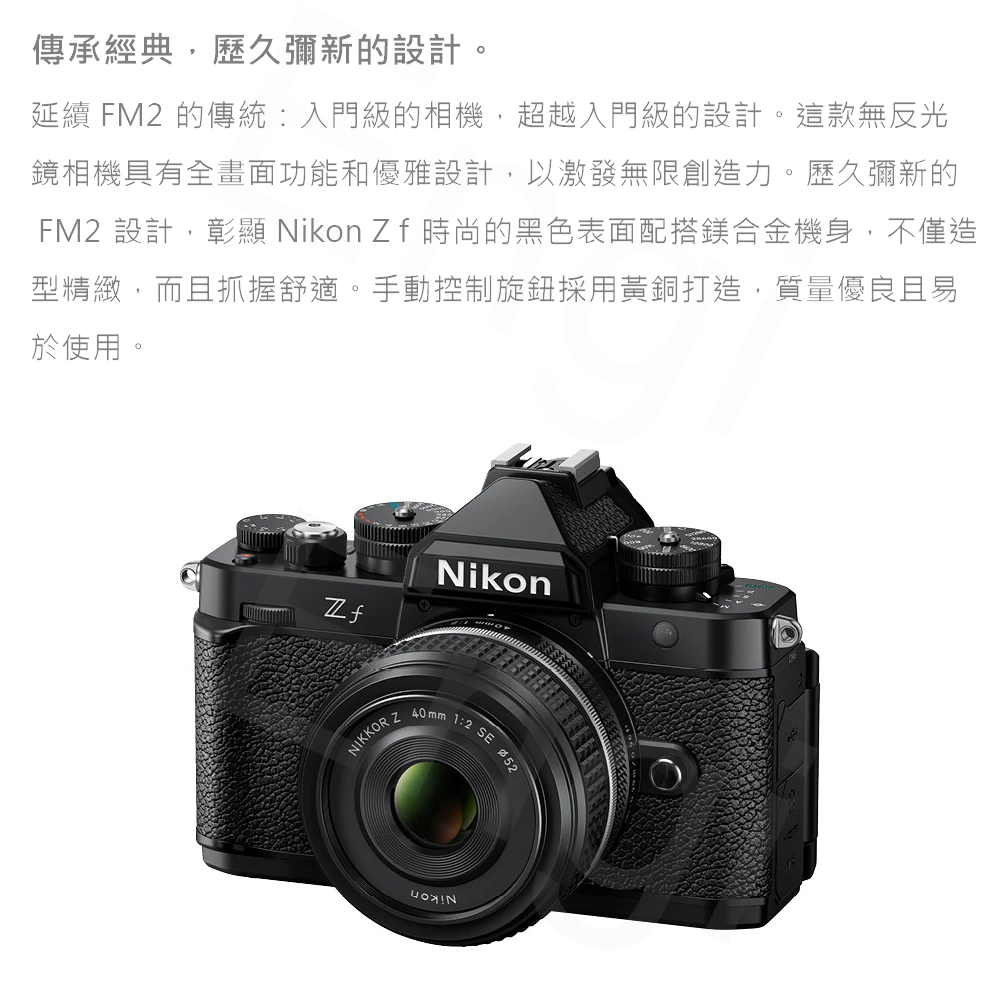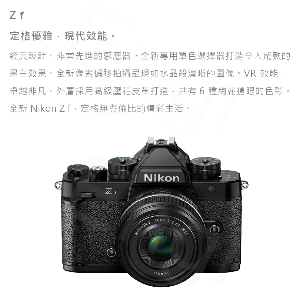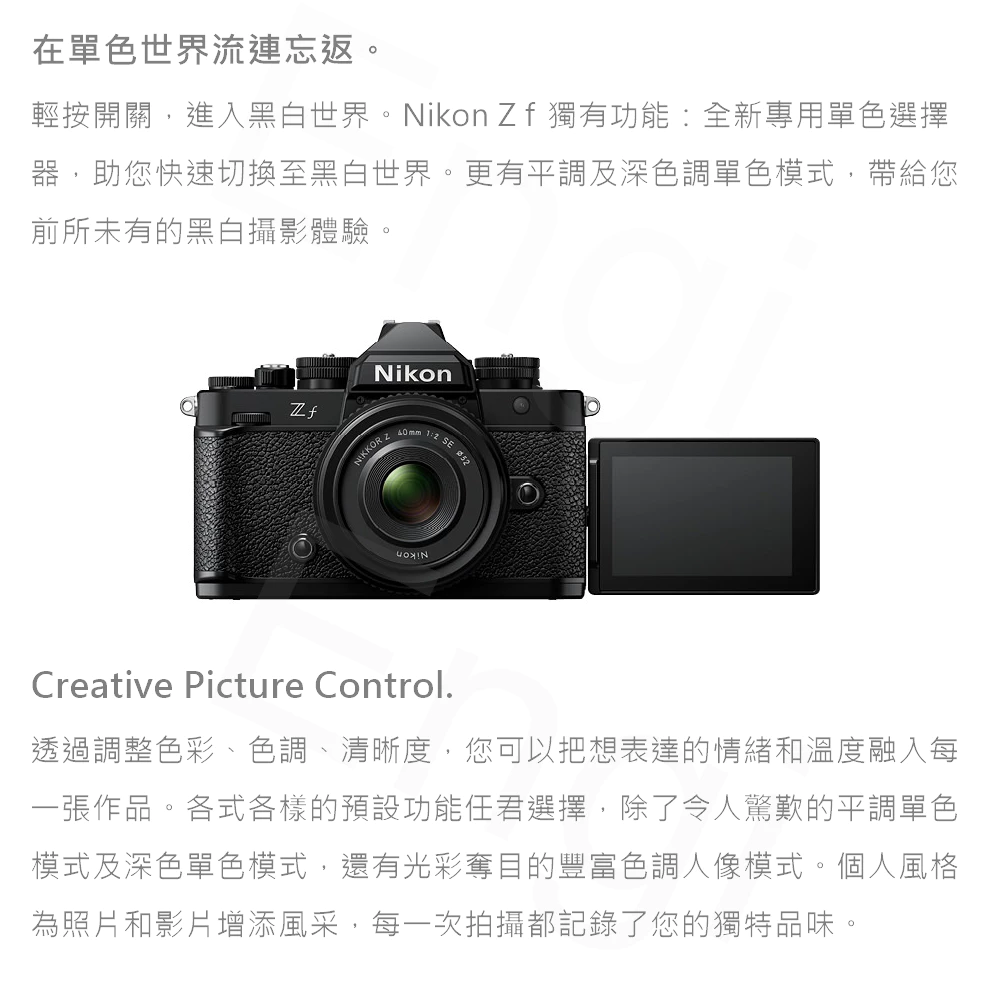 相機可以用來進行創意拍攝,相機可以表達自己的觀點。 Z f全片幅微單相機的標誌性外觀的靈感源自FM2,其中包含了Nikon技術的精巧智慧和強大功能。 Z f旨在表達您的個性,其風格將激發您的美學感官,其性能會釋放您的創意心聲,幫助您找到新的、獨特的表達自我的方式。 鼓舞人心的設計讓您從第一眼看到它和第一次觸摸它就會點燃您的熱情。 拿在手中感受、體驗和使用,並以更有引人入勝的方式進行創作。 透過發現不同的創作途徑,來探索您的新潛力。 您只需輕輕一按控制桿,即可透過美麗的單色,以新的方式觀察世界。 新的自動對焦性能可讓您充分發揮創意,捕捉街頭的節奏。 記錄平滑穩定的運動,呈現豐富的色調和色彩。 即使在昏暗的環境下,也能以奢華的全片幅影像品質呈現銳利、清晰、美麗的影像,來表達您的心聲。 自豪地表達您的熱情、風格、創意和自我,成為真正的自己。