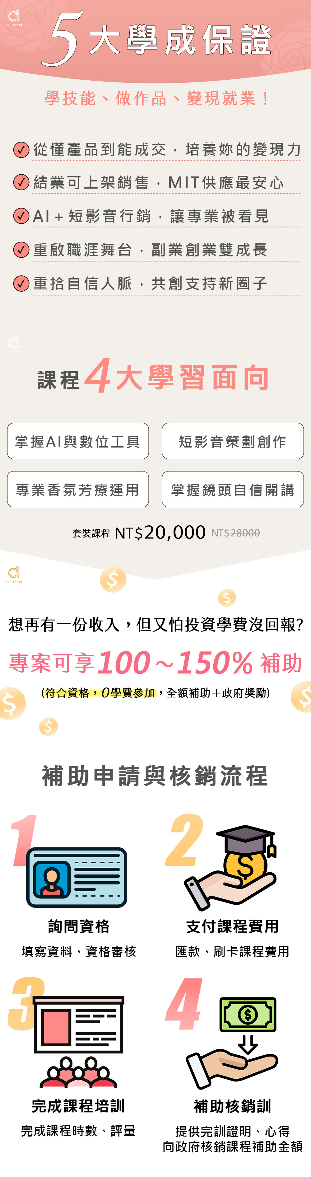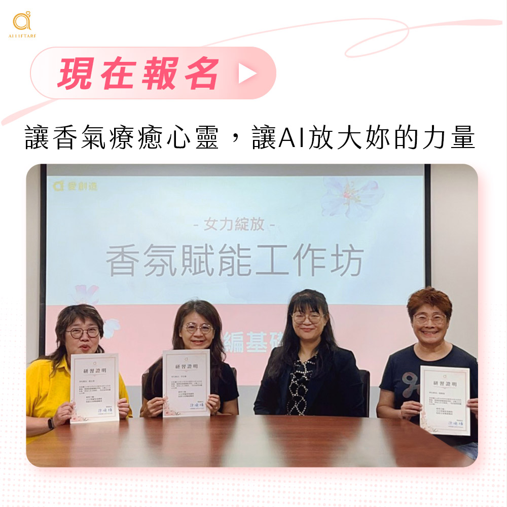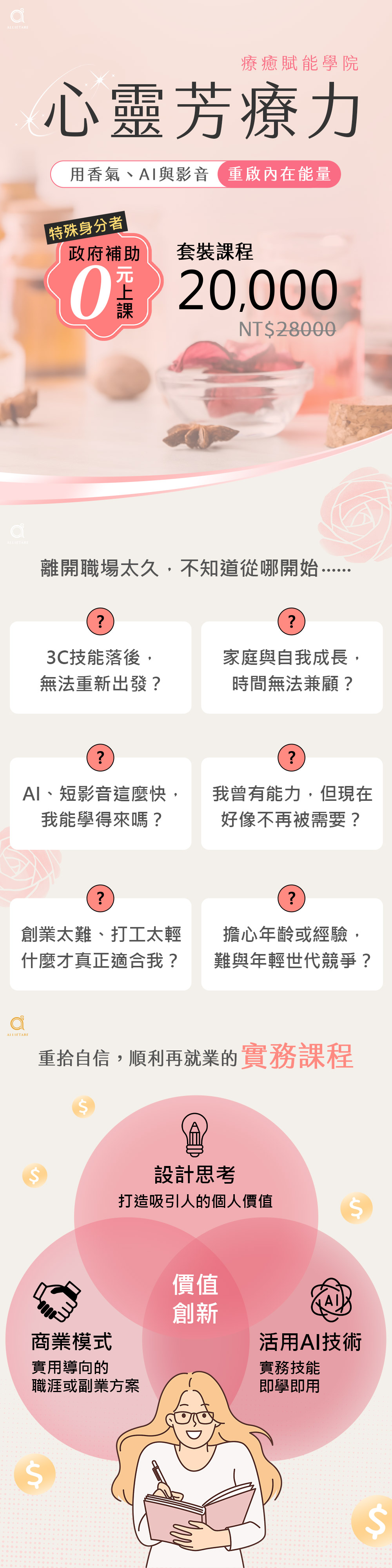 專為二度就業女性打造的實務課程,結合AI工具、短影音行銷與香氛療癒,陪妳從零打造心靈與品牌雙成長之路。