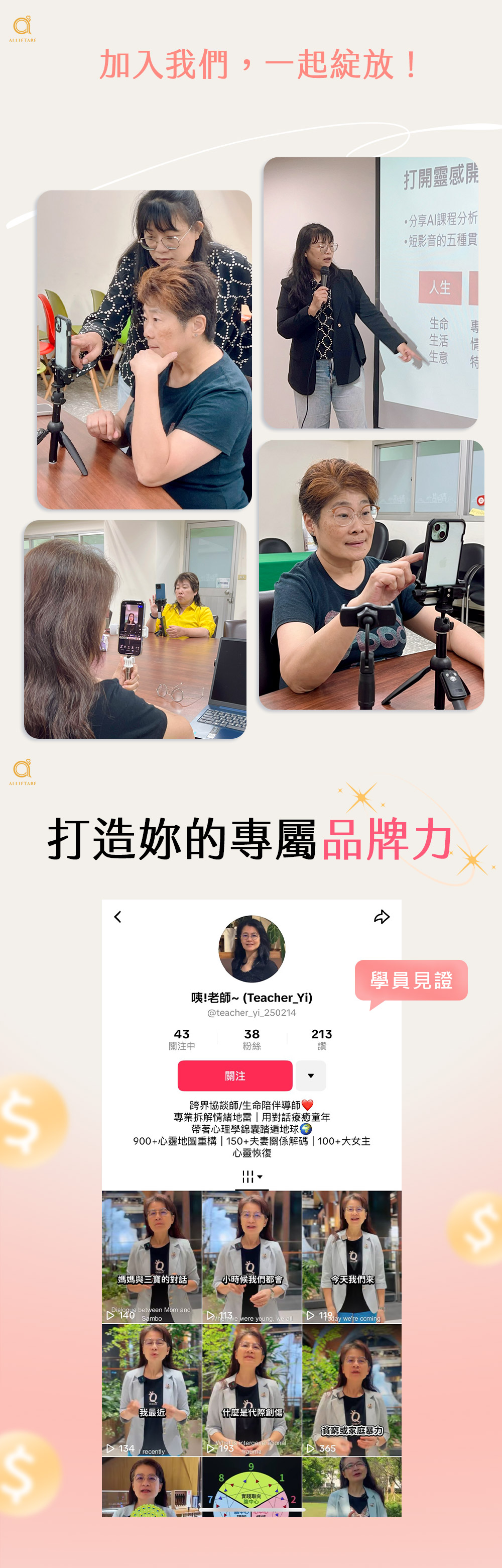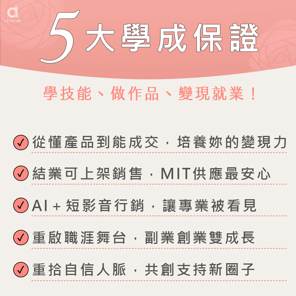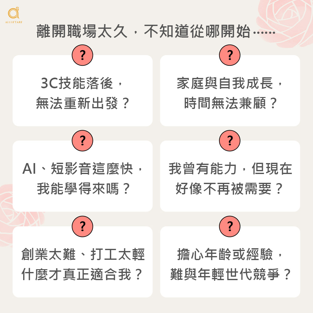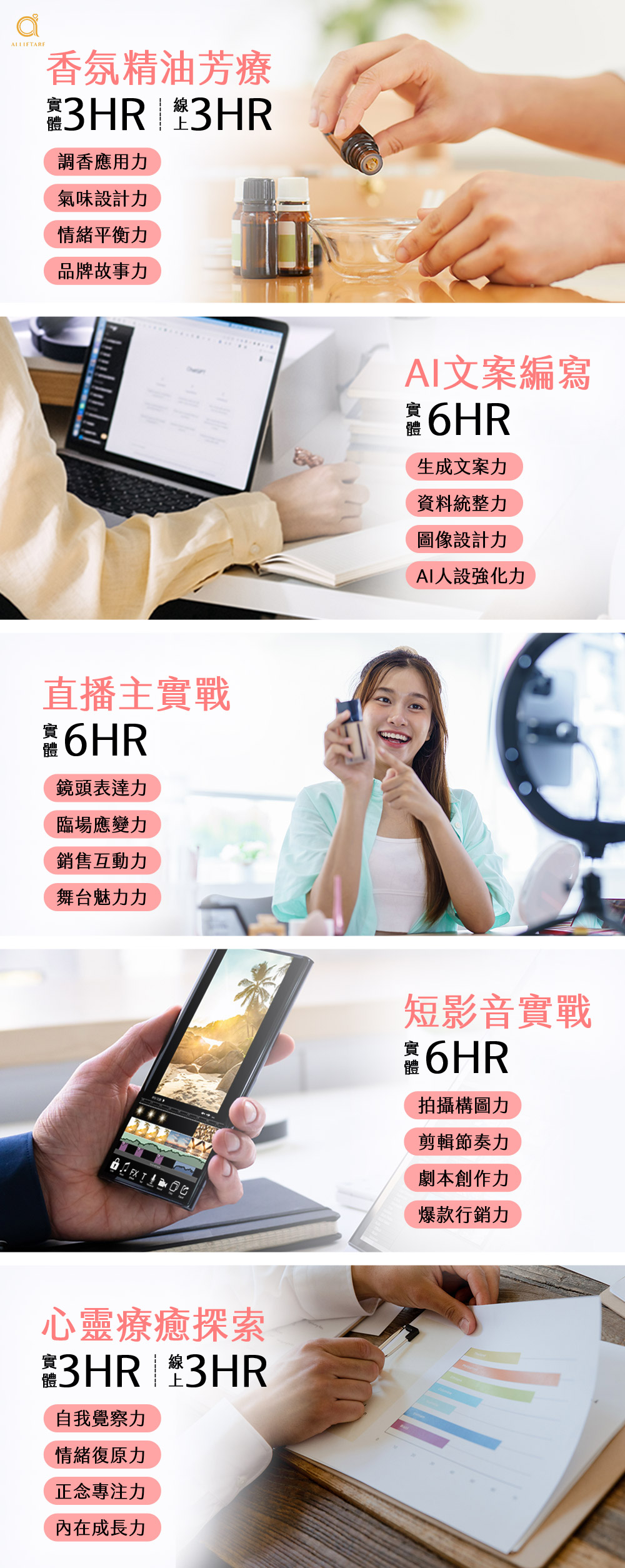 專為二度就業女性打造的實務課程,結合AI工具、短影音行銷與香氛療癒,陪妳從零打造心靈與品牌雙成長之路。