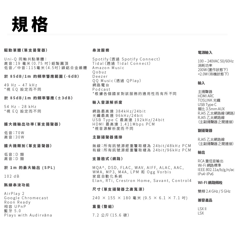 ● 支援最高達 24/384kHz ● 增HDMI ARC與USB-C ● W2無線平台提供強大無線串流 ● 隨插即用可加購配件 ● 左右雙聲道合計 200W 系統功率 ● 英國經典音響品牌 x Michael Young 極簡美學設計