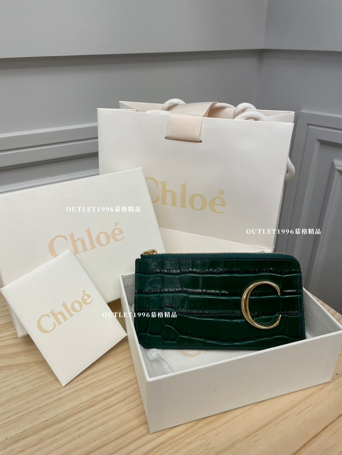 CHLOE C字 綠色鱷魚壓紋卡夾包