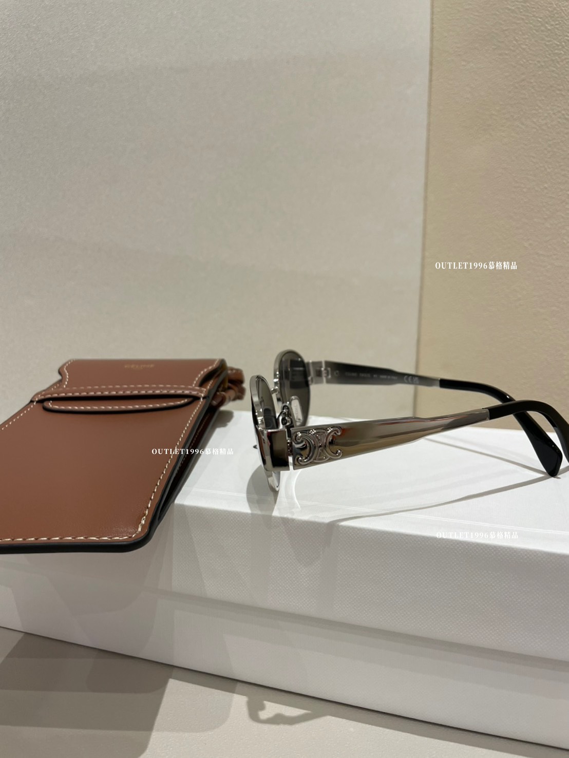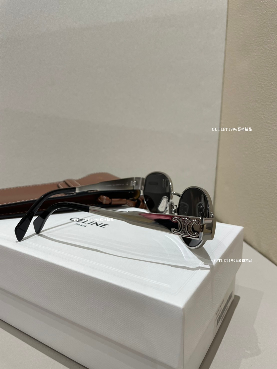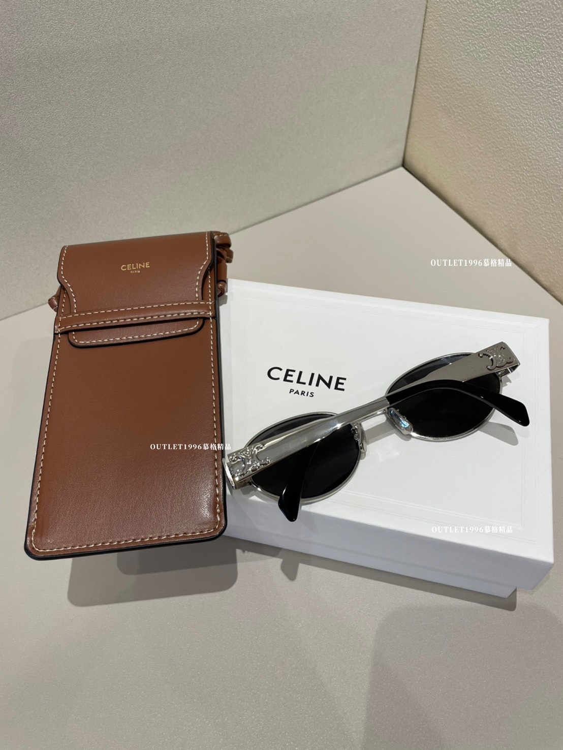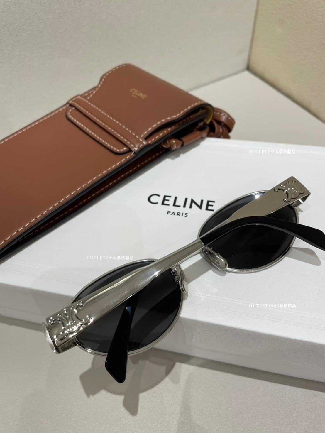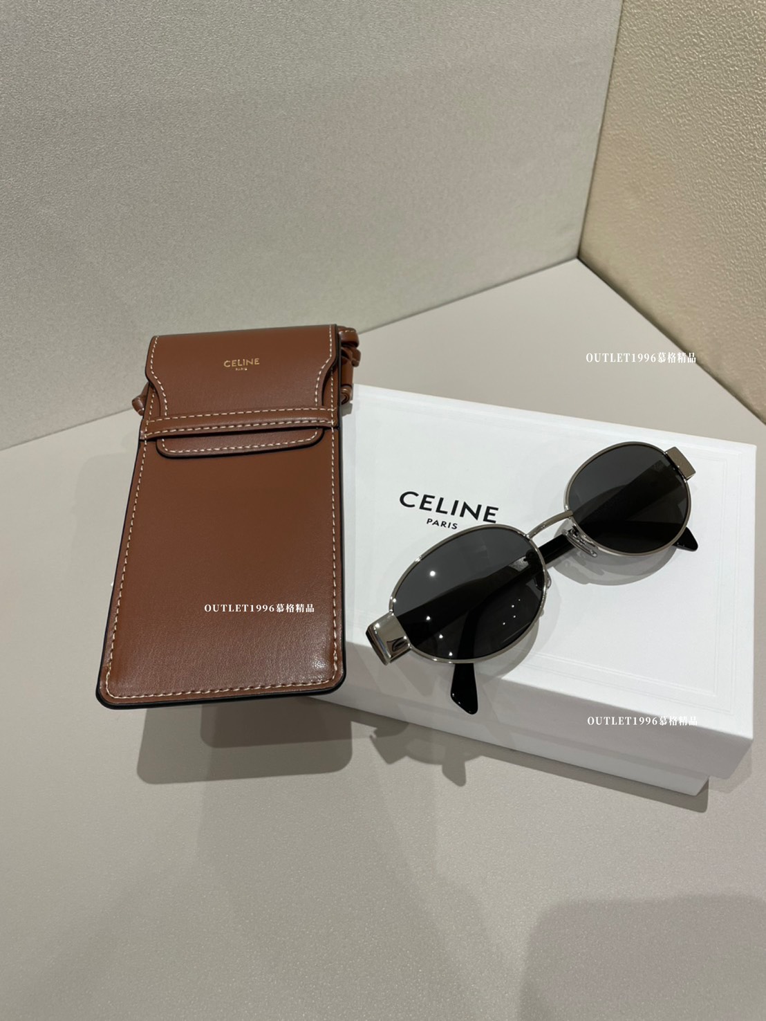 Celine 銀色橢圓墨鏡 配 焦糖色墨鏡包