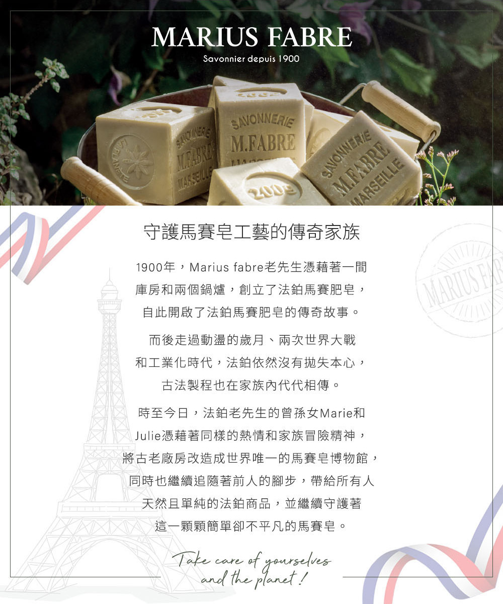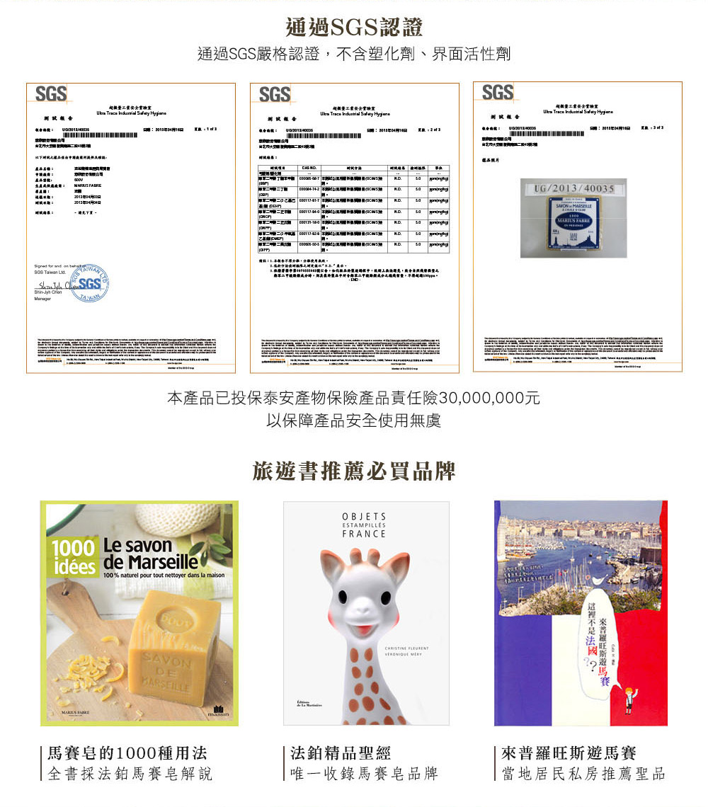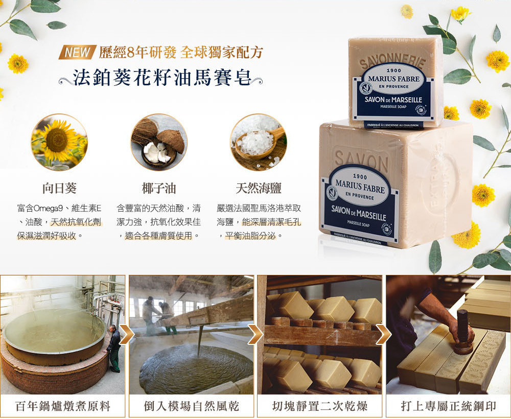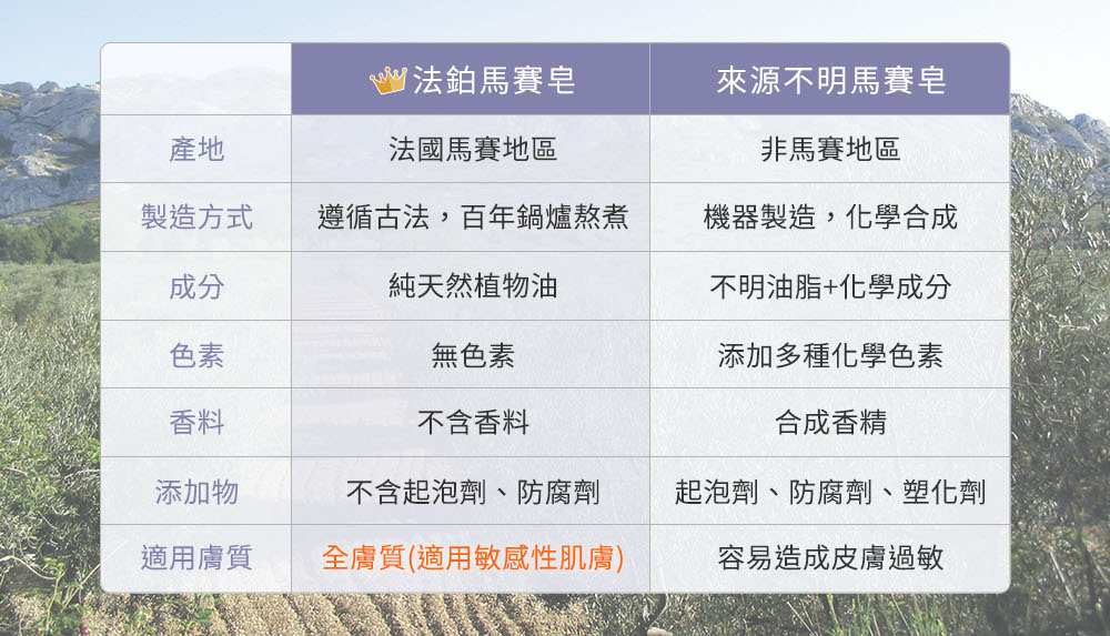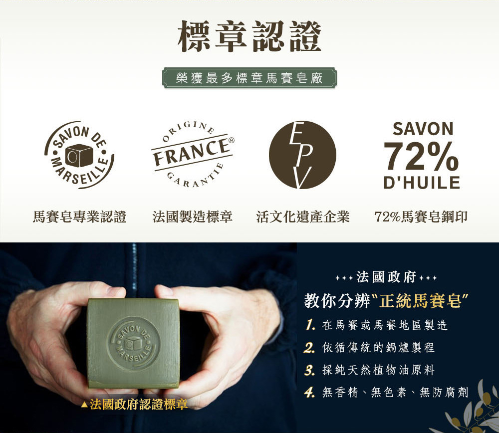 法國原裝進口,恪遵1688年馬賽古法製程純植物油成分,天然溫和,不含棕櫚油富含維生素E,使肌膚散發自然亮麗光澤不添加色素,可自然分解,不採動物測試亦可作為家事皂(洗碗、洗衣等)使用
