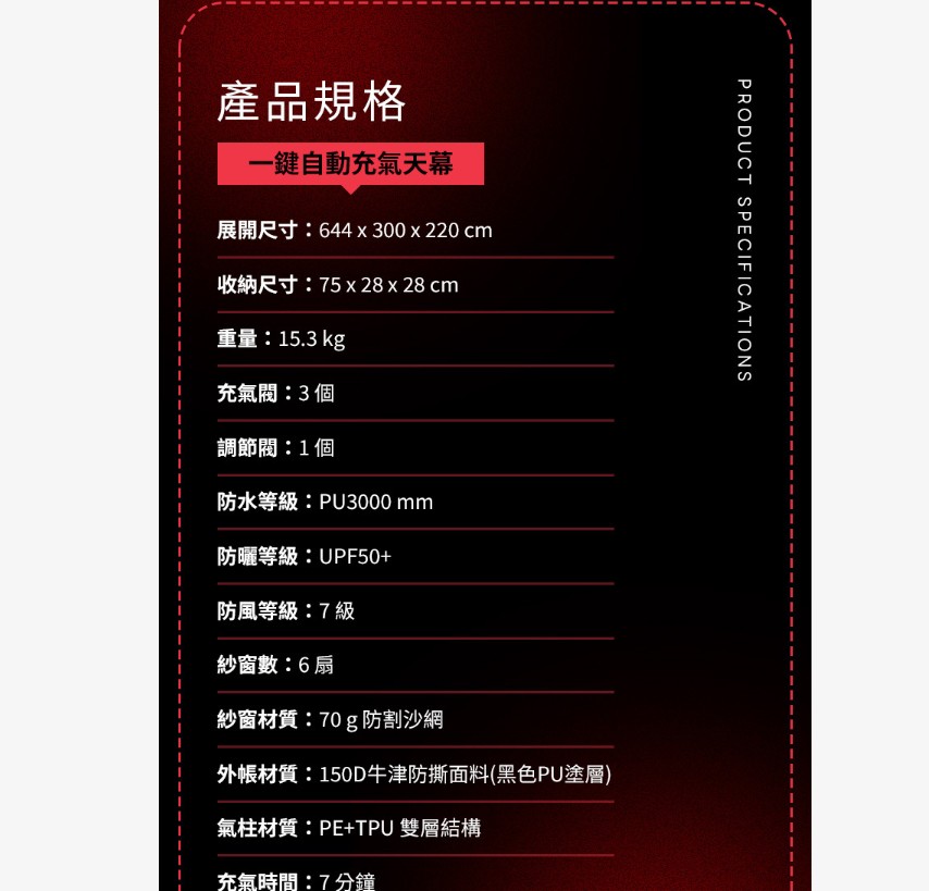 ◇一鍵充氣,輕鬆搭建 ◇7分鐘內快速完成 ◇耐用150D抗撕牛津布 ◇抗風能力達7級標準 ◇UPF50+有效防曬 ◇PU3000防水全面防護 ◇打造尊爵級享受戶外體驗