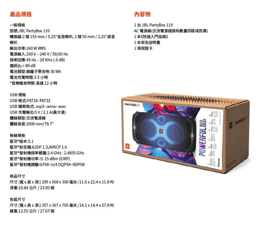 JBL Partybox 110 便攜式派對藍牙音響 露營開趴首選