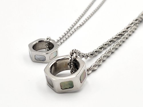 2個環對鍊是情人節最佳的送禮之一,它可以重覆表示深深的愛意和誓言。在墜飾上鑲嵌天然母貝(男-黑;女-白),充滿奢華的感覺,也可讓對方更加感受到你的心意。