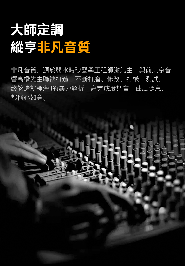 非凡音質,源於弱水時砂聲學工程師謝先生,與前東京音響高橋先生聯袂打造,不斷打磨、修改、打樣、測試, 終於造就靜海II的暴力解析、高完成度調音。曲風隨意, 都稱心如意。