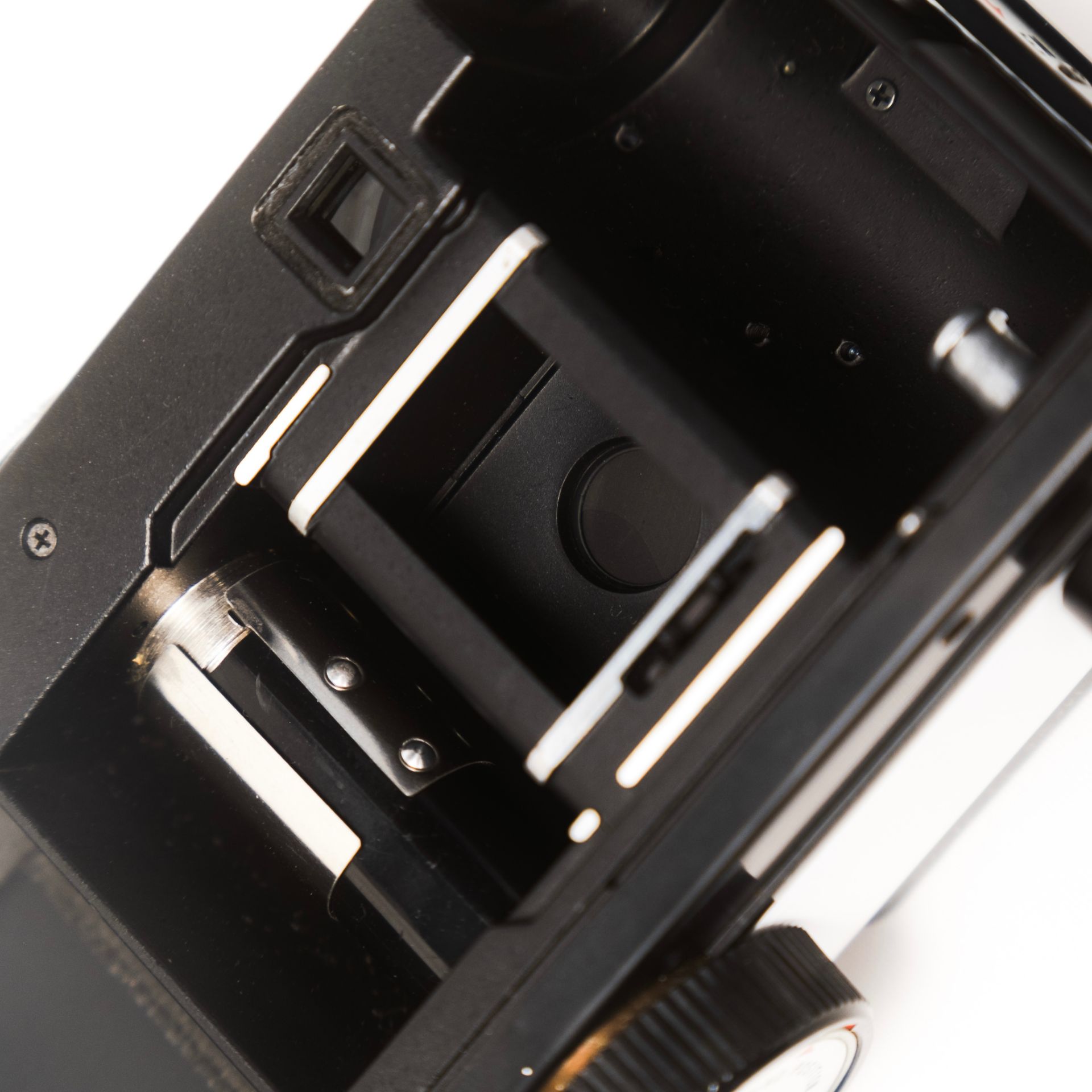 - 利用鏡頭周圍的硒電池板來供電,畫面中央有一顆黃色的小圓,當圓形變成紅色便是提醒光源不足。
