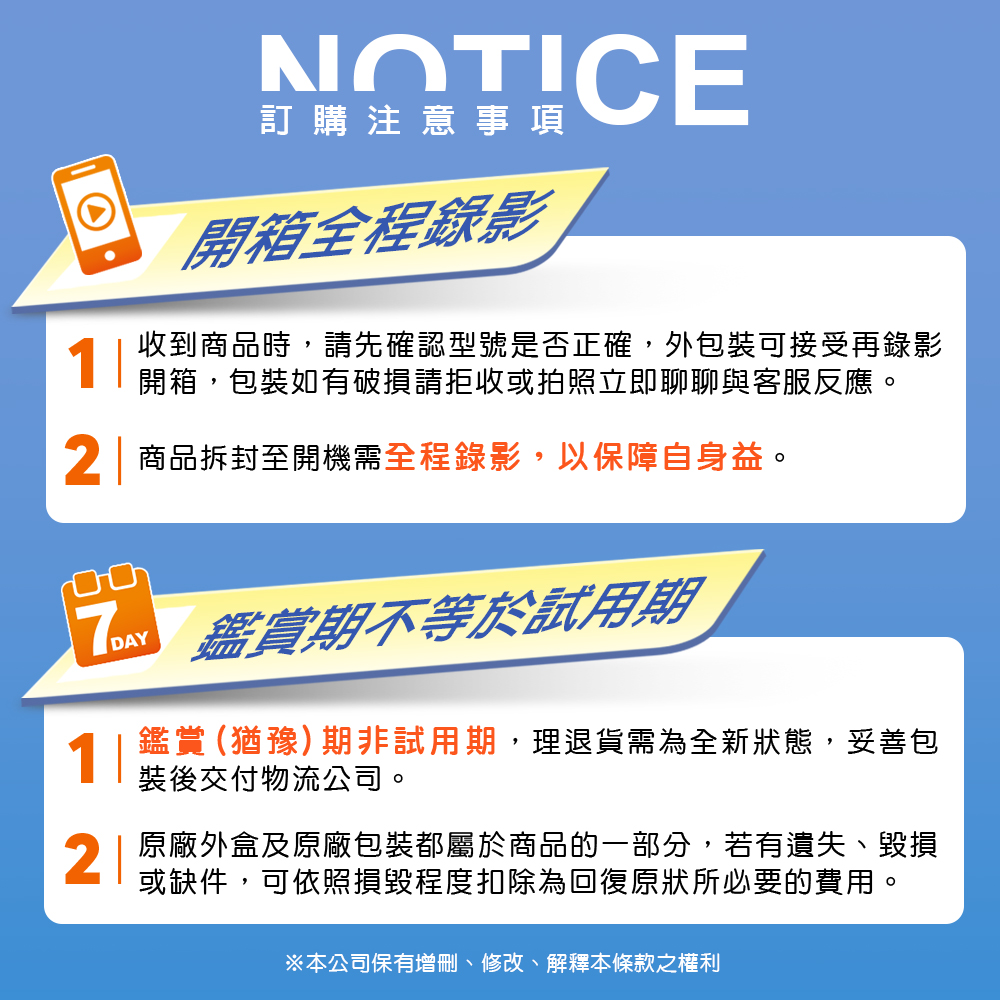 ※新品如有瑕疵,請保持本體完整、保留產品外盒及完整配件(請勿在產品上黏貼膠帶或者塗鴉),使用原包裝回復原狀,收納好產品,以便後續辦理退換貨流程。