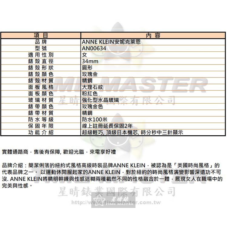 ANNE KLEIN安妮克萊恩女錶,編號AN00634,34mm玫瑰金錶殼,玫瑰金色錶帶款