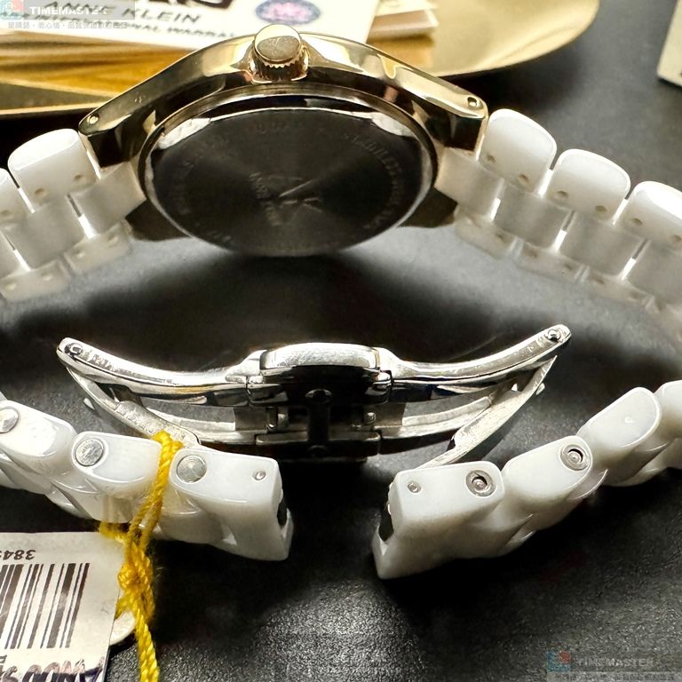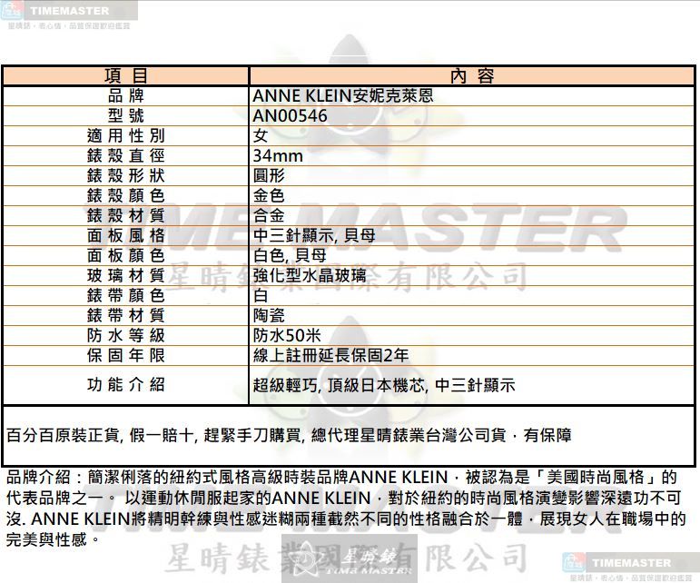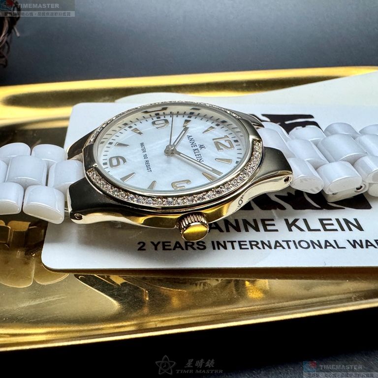 ANNE KLEIN手錶,編號AN00546,34mm金色圓形合金錶殼,白色, 貝母中三針顯示, 貝母錶面,白陶瓷錶帶款