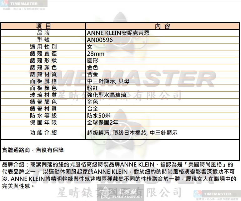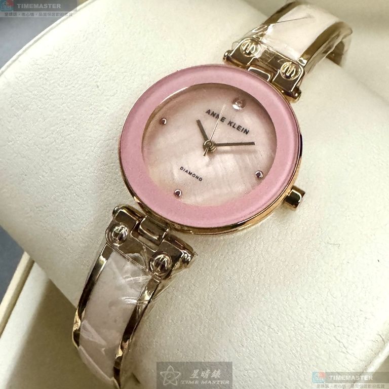 ANNE KLEIN手錶,編號AN00596,28mm金色圓形合金錶殼,粉紅中三針顯示, 貝母錶面,金色合金錶帶款