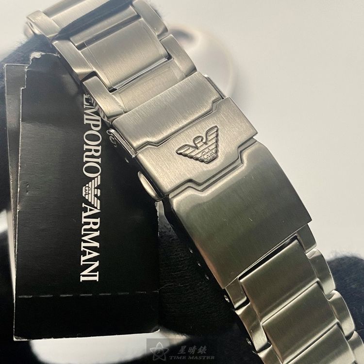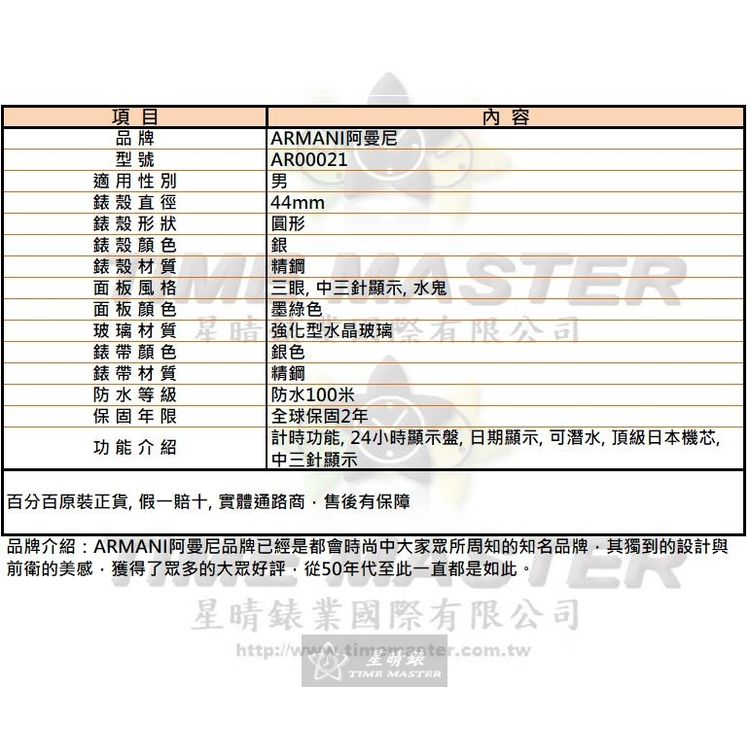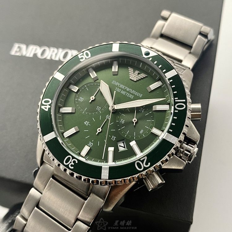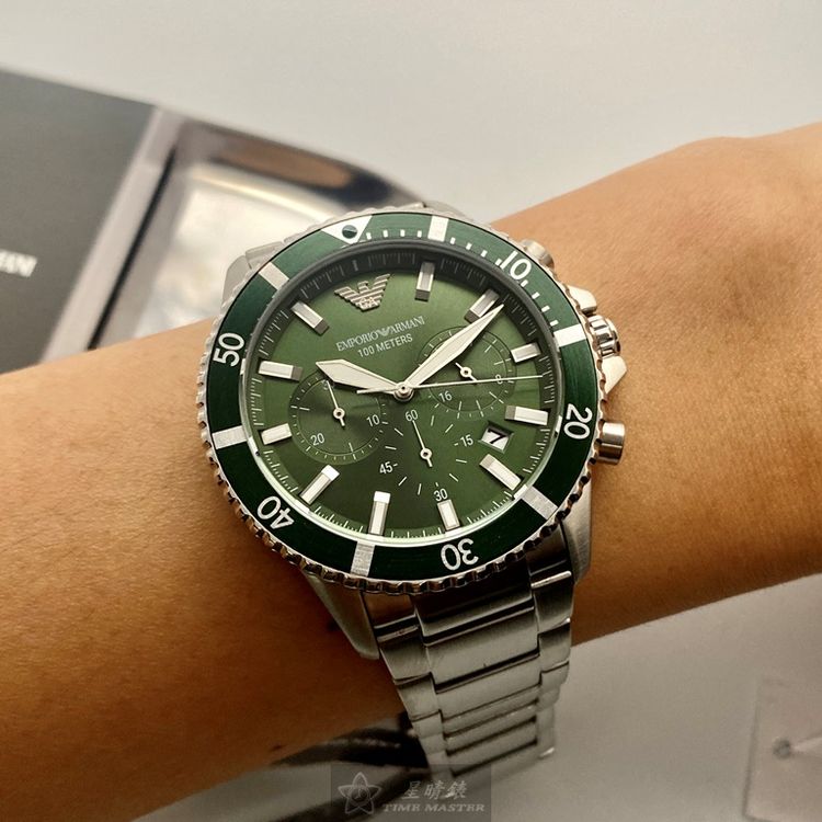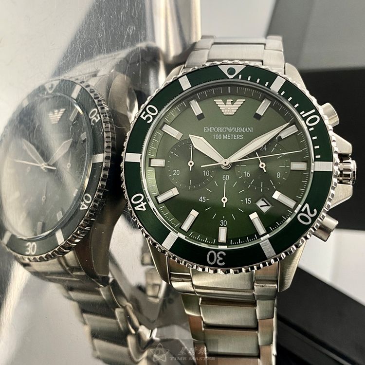 ARMANI手錶,編號AR00021,44mm銀圓形精鋼錶殼,墨綠色三眼, 中三針顯示, 水鬼錶面,銀色精鋼錶帶款