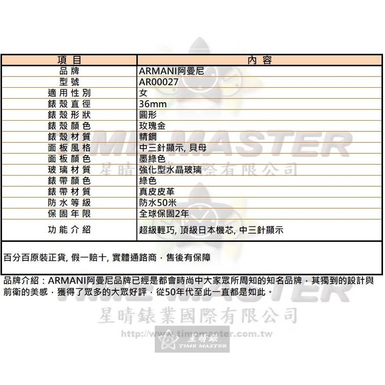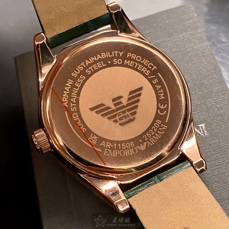ARMANI手錶,編號AR00027,36mm玫瑰金圓形精鋼錶殼,墨綠色中三針顯示, 貝母錶面,綠色真皮皮革錶帶款