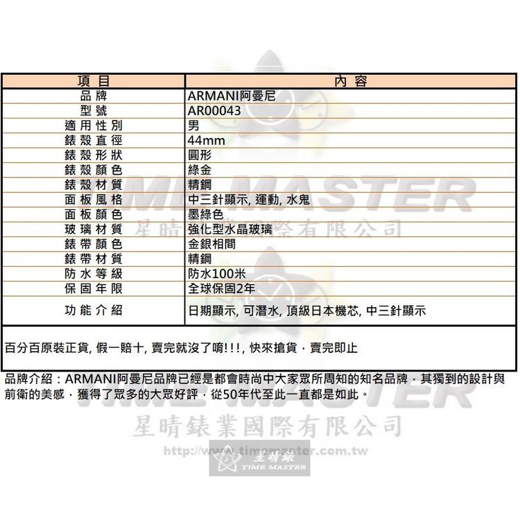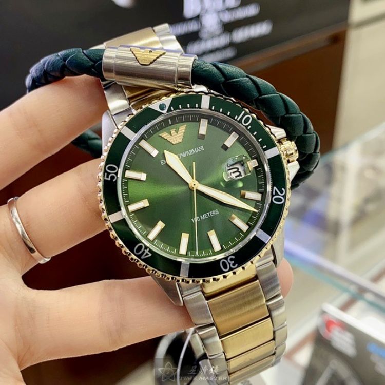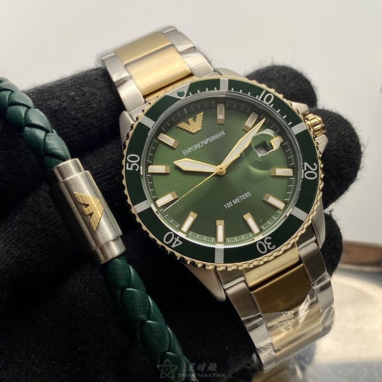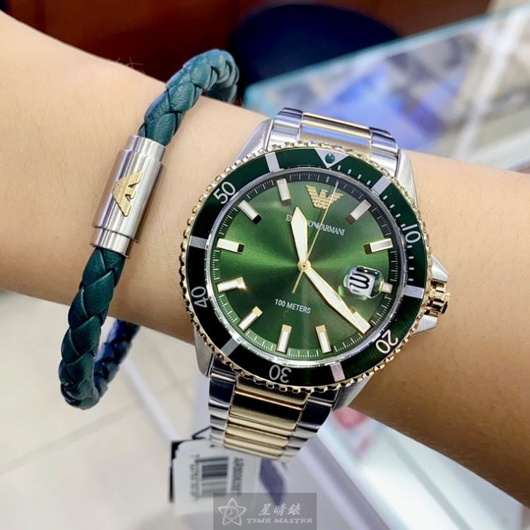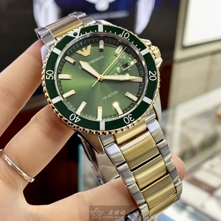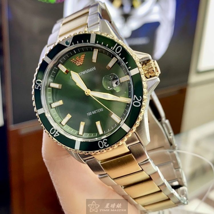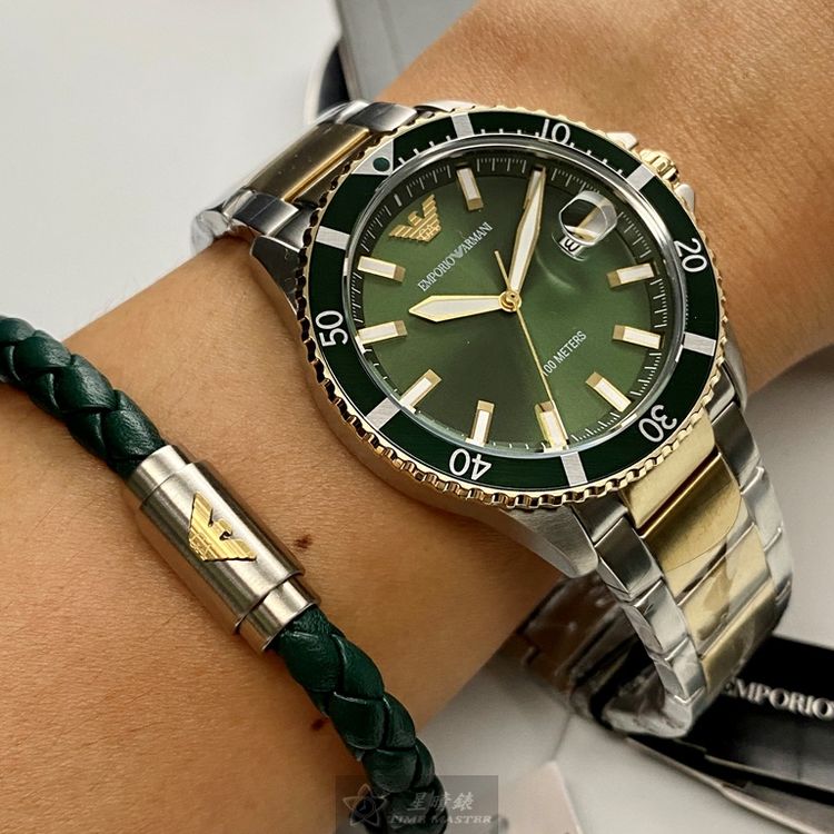 ARMANI手錶,編號AR00043,44mm綠金圓形精鋼錶殼,墨綠色中三針顯示, 運動, 水鬼錶面,金銀相間精鋼錶帶款-[置頂推薦]