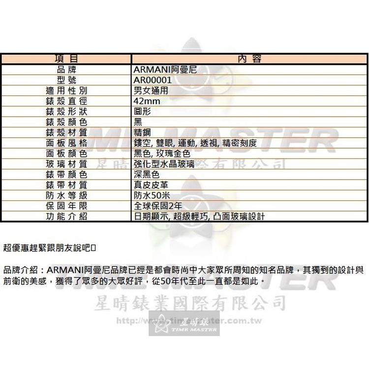 ARMANI阿曼尼男女通用錶,編號AR00001,42mm黑錶殼,深黑色錶帶款