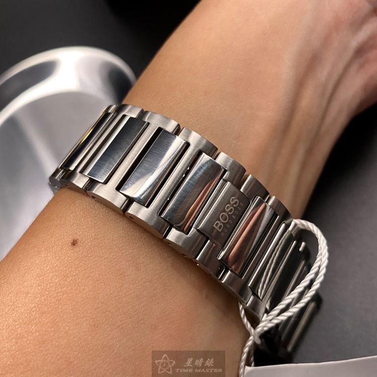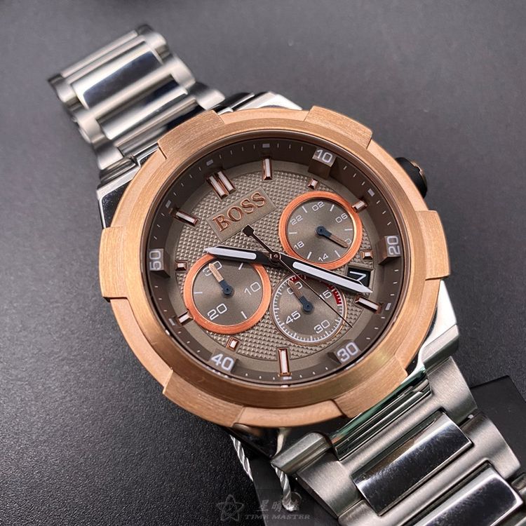 BOSS伯斯男錶,編號HB1513362,46mm玫瑰金圓形精鋼錶殼,古銅色三眼錶面,銀色精鋼錶帶款