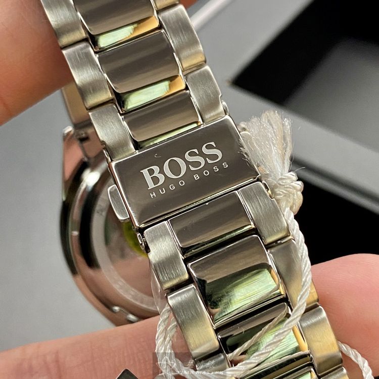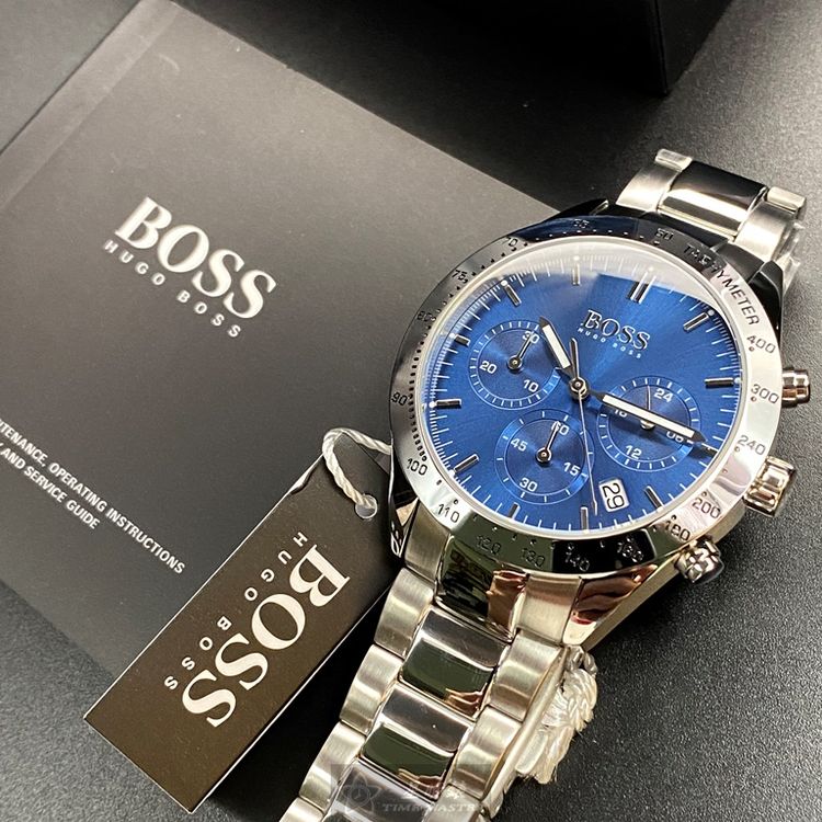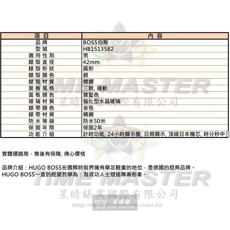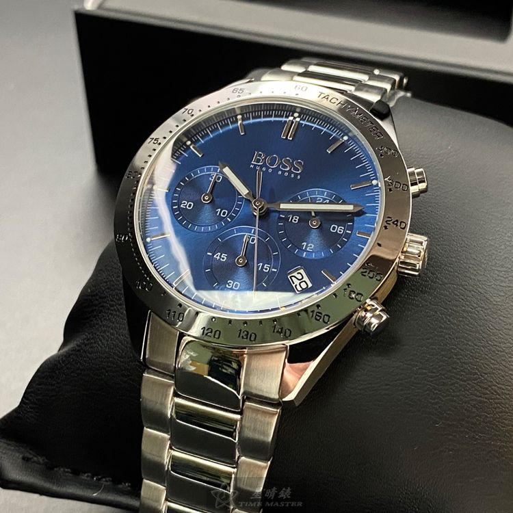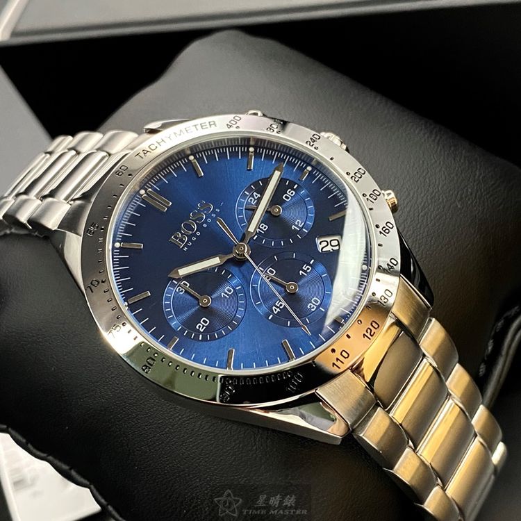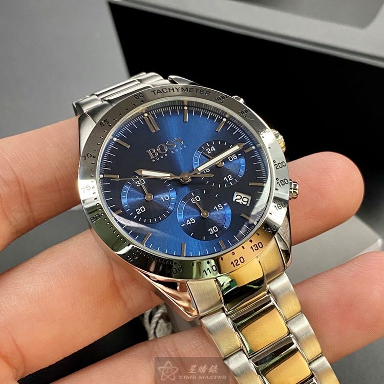 BOSS手錶,編號HB1513582,42mm銀圓形精鋼錶殼,寶藍色三眼, 運動錶面,金色精鋼錶帶款,找尋好久就是這款!