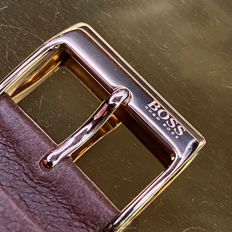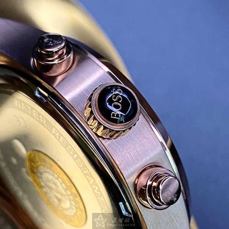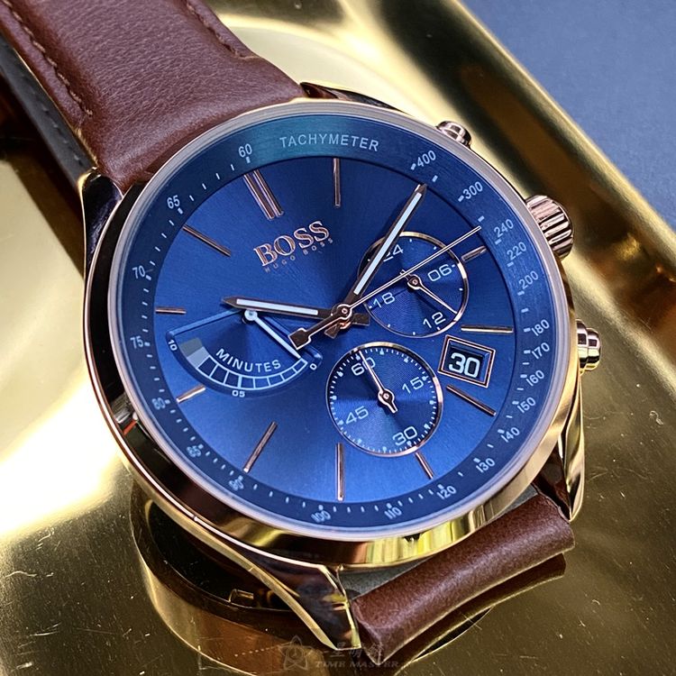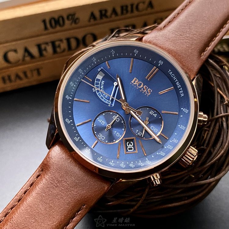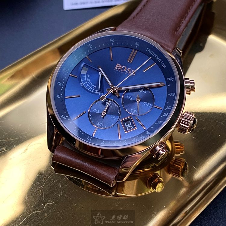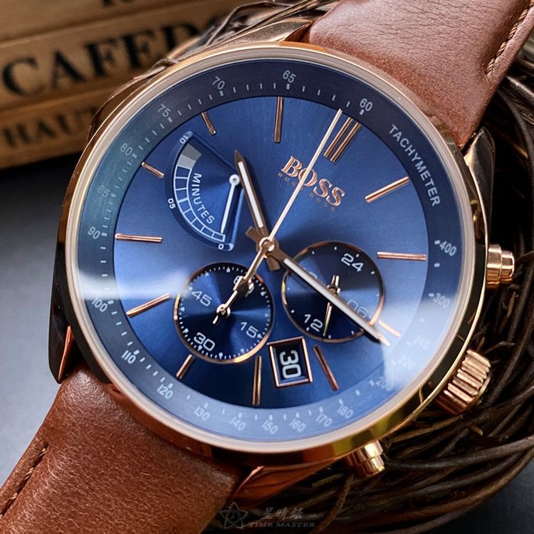 BOSS手錶,編號HB1513604,44mm玫瑰金圓形精鋼錶殼,寶藍色三眼錶面,咖啡色真皮皮革錶帶款,閃亮度冠絕全場!
