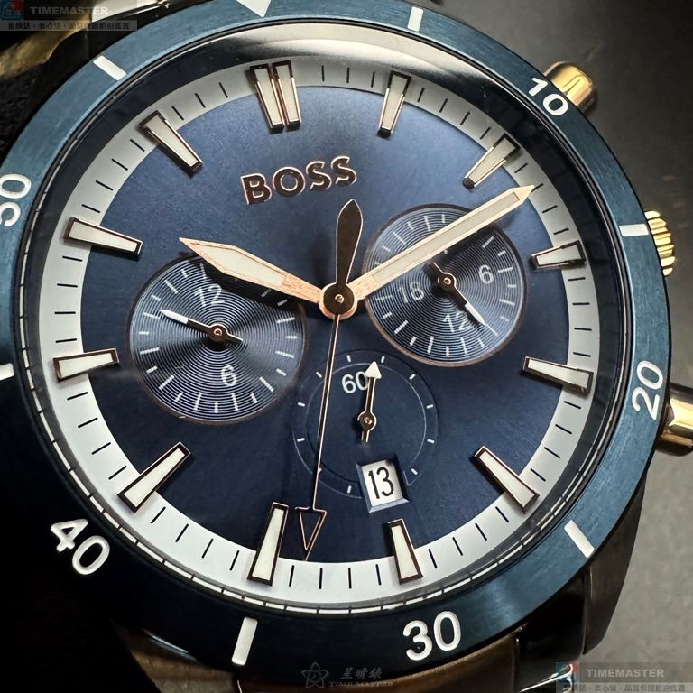 BOSS手錶,編號HB1513937,46mm寶藍圓形精鋼錶殼,寶藍色羅馬數字, 中三針顯示錶面,金銀相間精鋼錶帶款