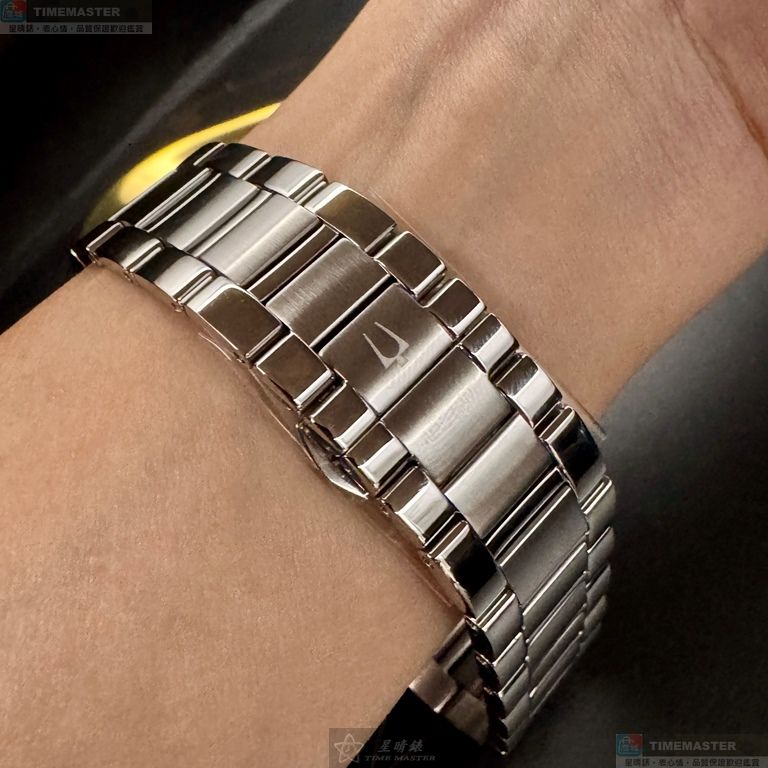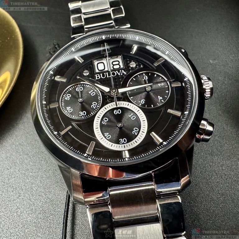 BULOVA手錶,編號BU00006,44mm銀圓形精鋼錶殼,黑色三眼, 中三針顯示, 日曆窗錶面,銀色精鋼錶帶款