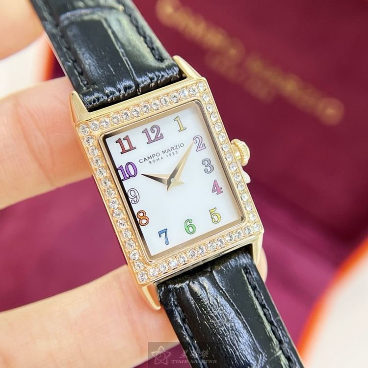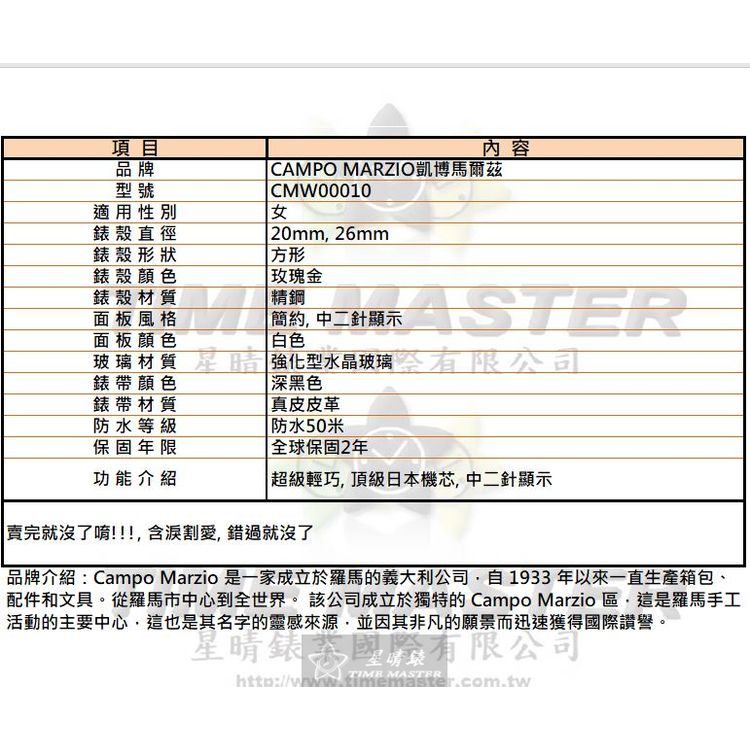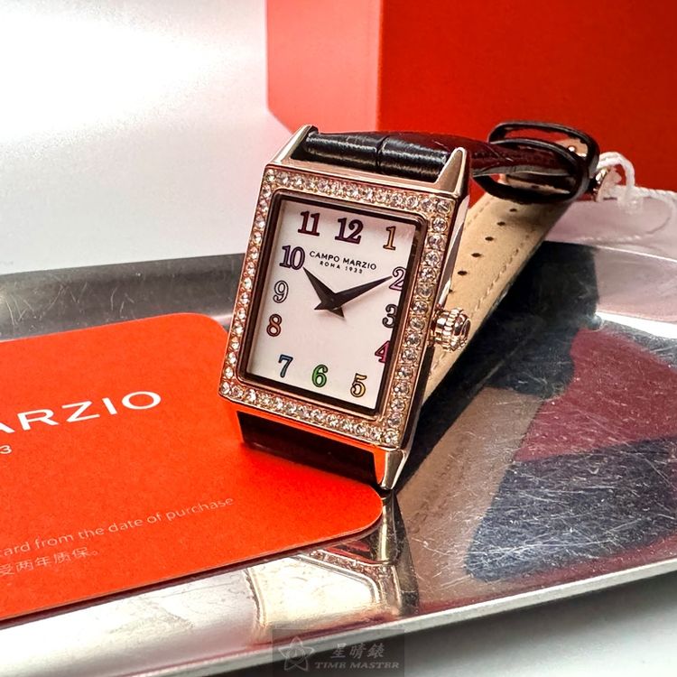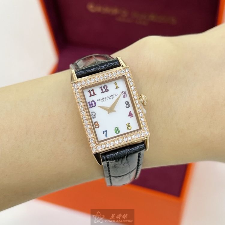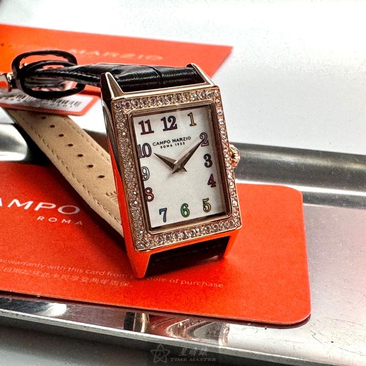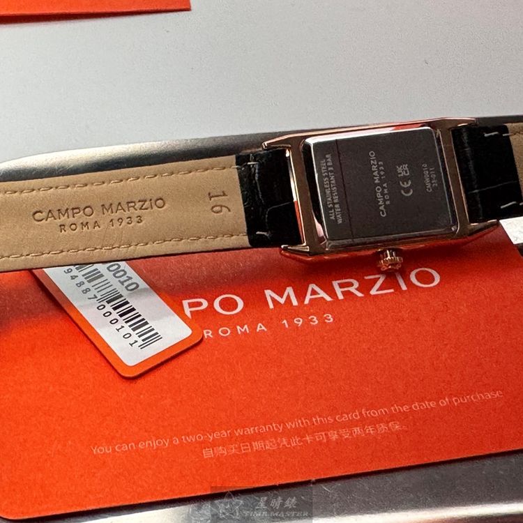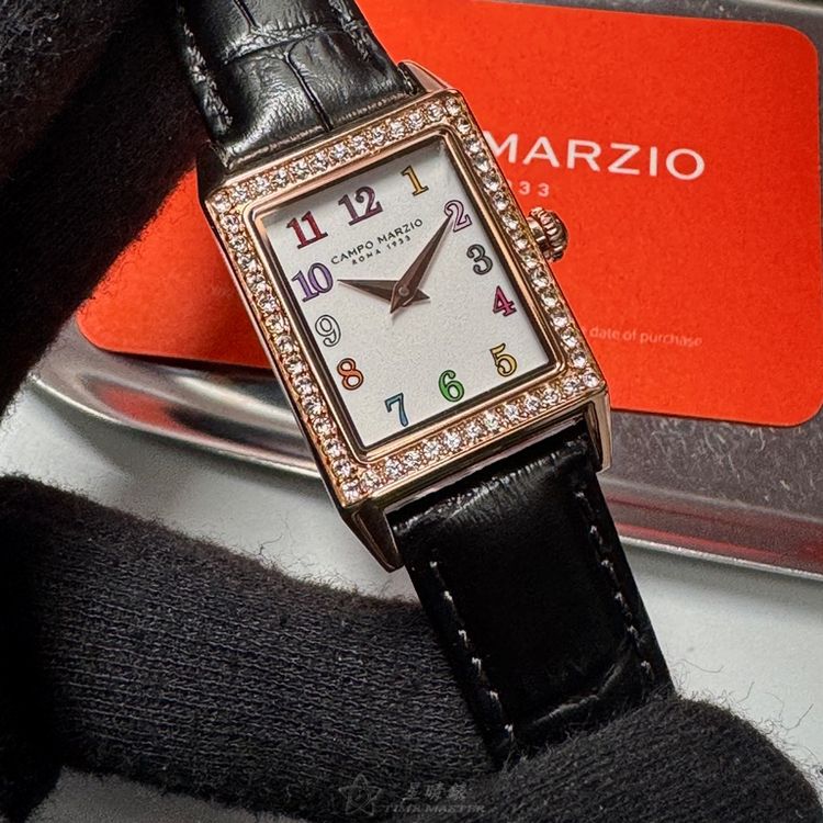 星晴錶業獻上CAMPO MARZIO凱博馬爾茲女錶CMW00010,石英機芯,20mm及26mm方形玫瑰金精鋼錶殼,白色簡約面板,強化型水晶玻璃,搭配深黑色真皮皮革錶帶。超級輕巧,頂級日本機芯,中二針顯示,防水50米。全球保固2年,時尚與品質兼備,優雅女性的最佳選擇。