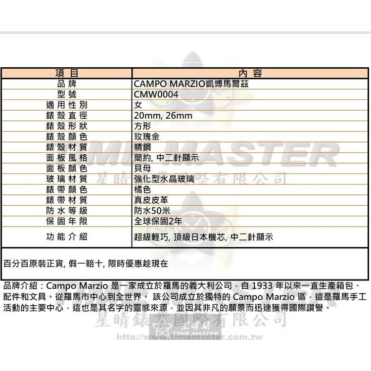 星晴錶業為您呈現CAMPO MARZIO凱博馬爾茲女錶CMW0004,20mm和26mm兩種錶殼直徑,方形錶殼展現獨特品味。 石英機芯保證精準走時,搭載頂級日本機芯,讓您時刻保持精確。 錶殼以優雅的玫瑰金為主調,展現女性的柔美之美,精鋼材質打造堅固耐用。 簡約中二針顯示,貝母面板散發淡雅光芒,令人陶醉其中。 強化型水晶玻璃為您提供卓越的抗刮耐用性,確保您的錶面始終清晰如新。 搭配橘色真皮皮革錶帶,為您的腕間注入一抹活潑的色彩,展現獨特品味。 防水50米,讓您無懼日常生活中的水花,自在展現優雅風采。 CAMPO MARZIO凱博馬爾茲女錶CMW0004全球保固2年,超級輕巧設計,輕盈舒適,成就您獨一無二的時尚風采。