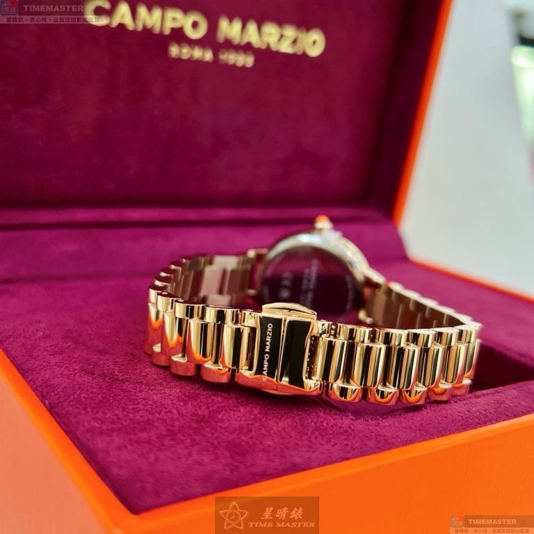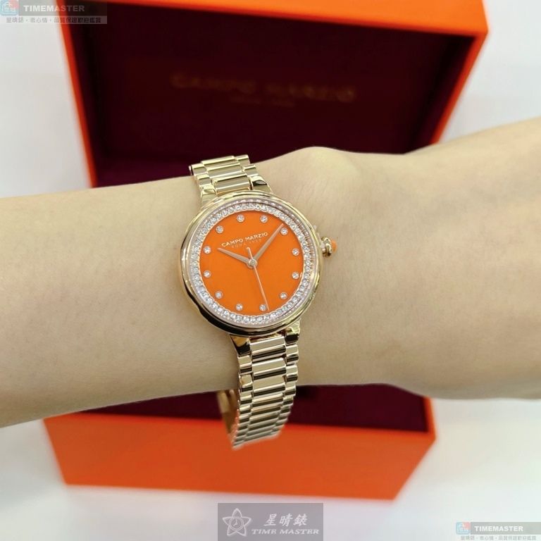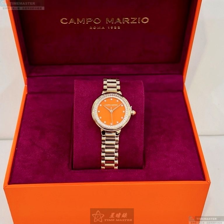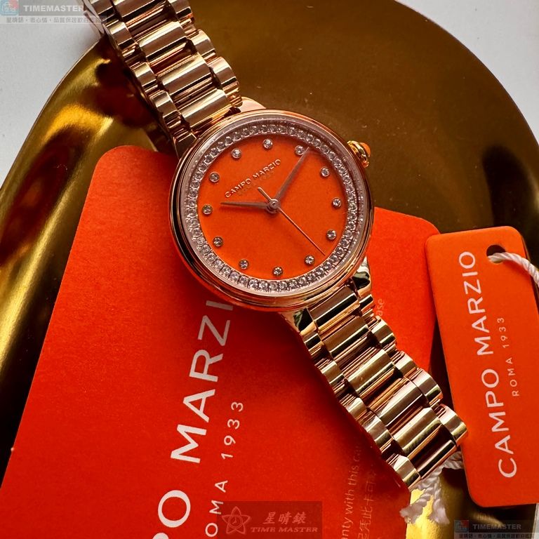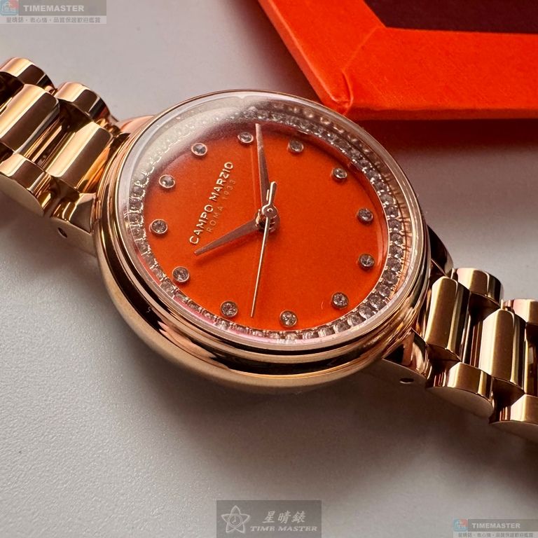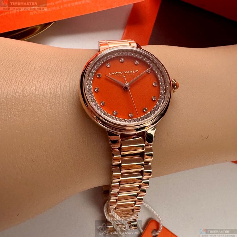 CampoMarzio手錶,編號CMW0030,28mm玫瑰金圓形精鋼錶殼,橘色簡約, 鑽圈錶面,玫瑰金色精鋼錶帶款