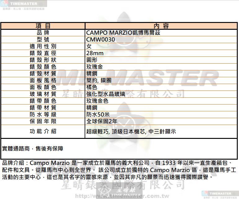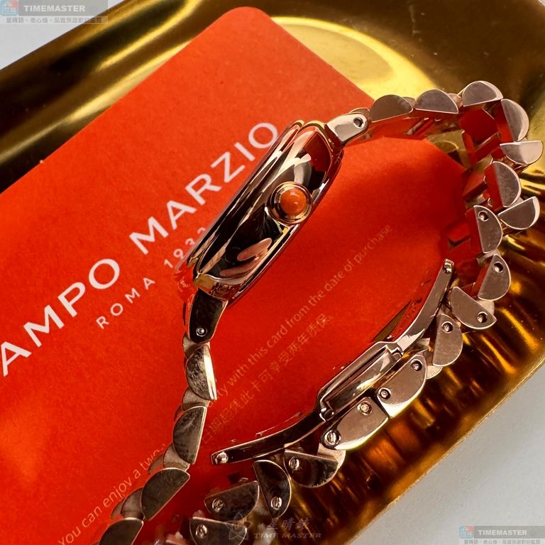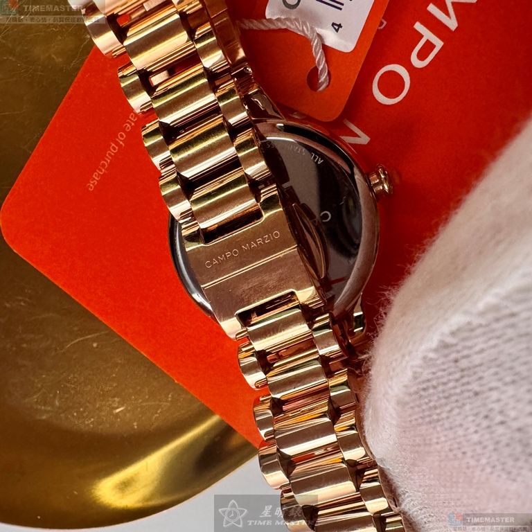 CAMPO MARZIO凱博馬爾茲 CMW0030 女錶 28mm,外型精緻圓潤,以玫瑰金精鋼打造,具備令人一眼難忘的鑽圈設計。 這只腕錶也許不是市場上最昂貴的選擇,但在每一處細節中展現出來的誠意,值得細細體會。 星晴錶業堅持只販售正貨商品,不求誇張吸睛,但求讓配戴者感受真實價值。 橘色面盤搭配中三針顯示,不搶眼卻穩重,適合日常穿搭也能在場合中脫穎而出。 搭載頂級日本石英機芯,時間穩定不偏差,讓你不用為時間奔波煩心。 強化型水晶玻璃鏡面耐磨耐刮,日常使用安心無虞,維持長久清晰度。 50米防水設計貼近實際生活所需,無論洗手或偶遇小雨都能輕鬆應對。 整體重量經過嚴格設計與測試,配戴感輕盈幾乎無負擔,是日常佩戴的理想選擇。 價格雖然不是最低,但我們更在意提供顧客值得信賴的品質與長期保固。 這不只是手錶,更是我們對正品責任的堅守,也是你每天面對世界的穩定依靠。