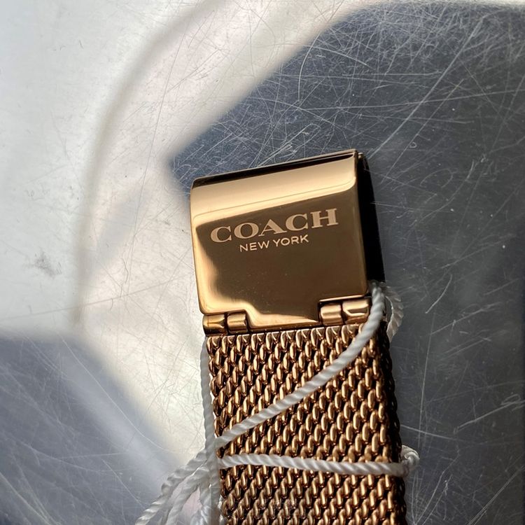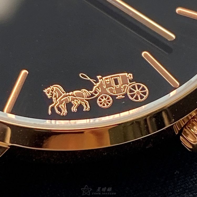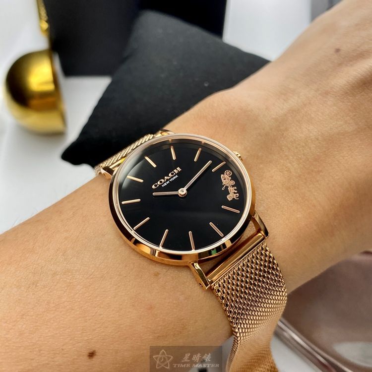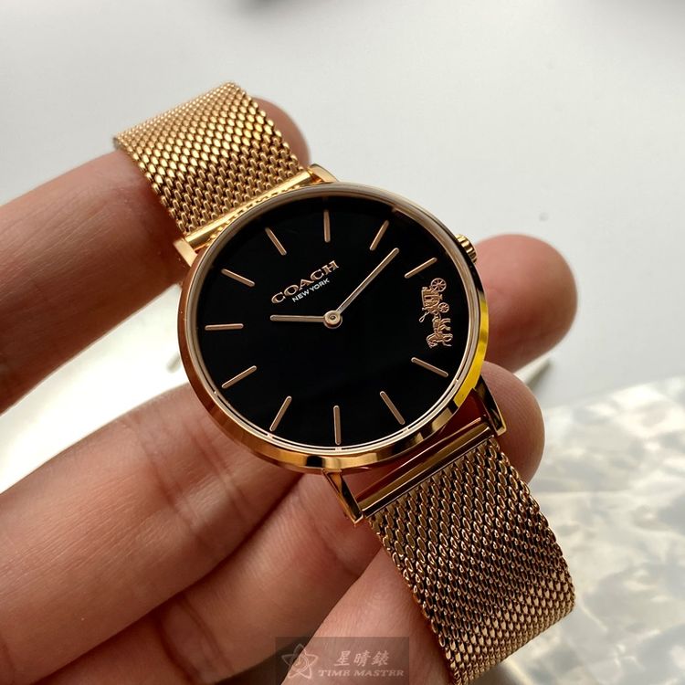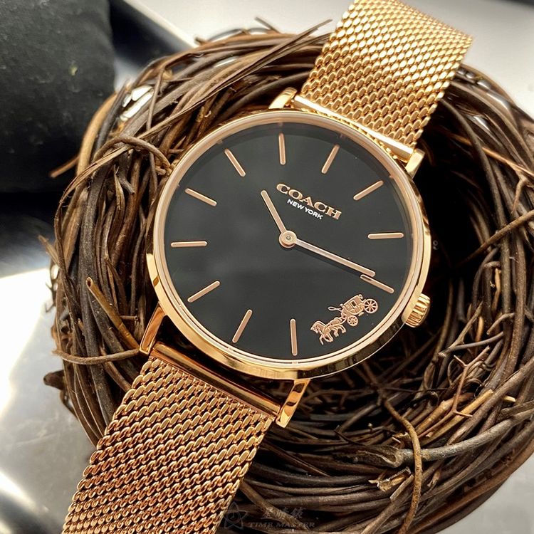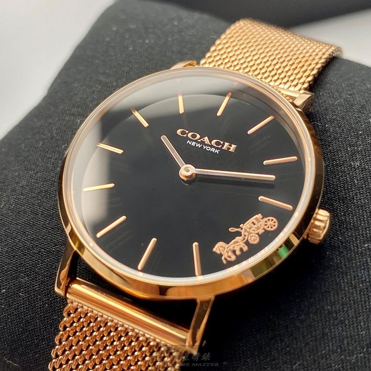COACH手錶,編號CH00026,32mm玫瑰金圓形精鋼錶殼,黑色簡約錶面,玫瑰金色米蘭錶帶款