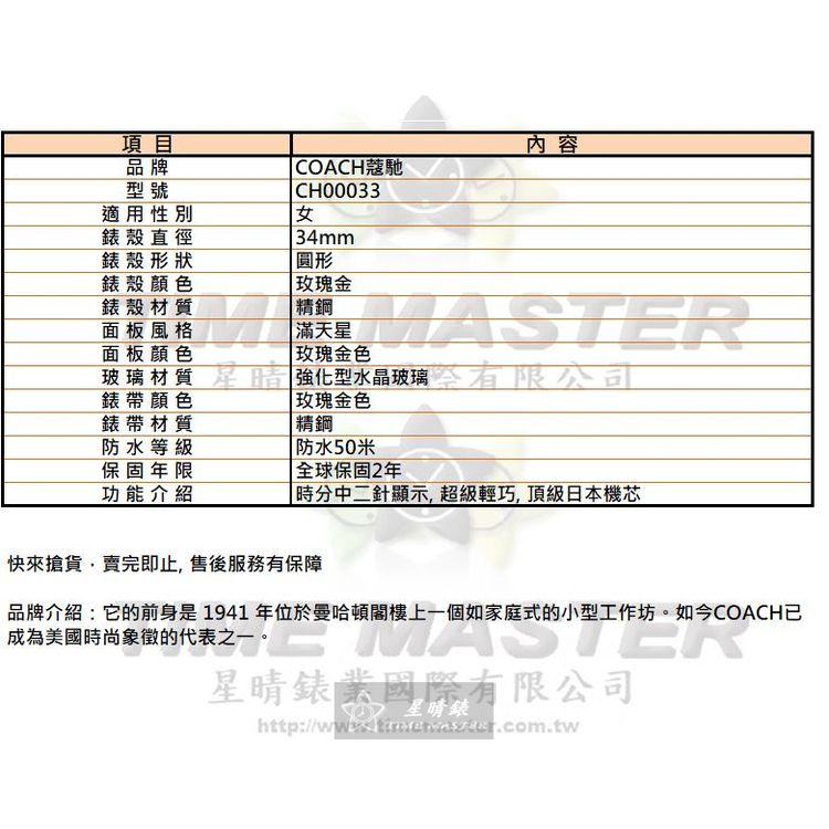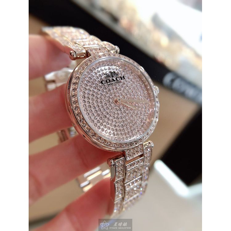 COACH手錶,編號CH00033,34mm玫瑰金圓形精鋼錶殼,玫瑰金色滿天星錶面,玫瑰金色精鋼錶帶款