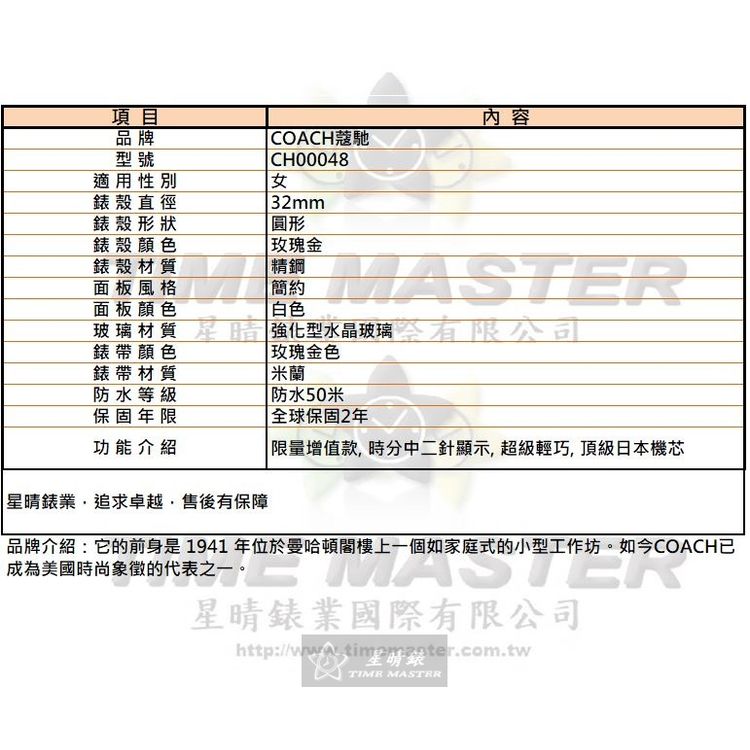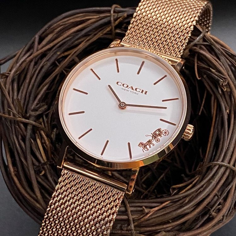 COACH手錶,編號CH00048,32mm玫瑰金圓形精鋼錶殼,白色簡約錶面,玫瑰金色米蘭錶帶款