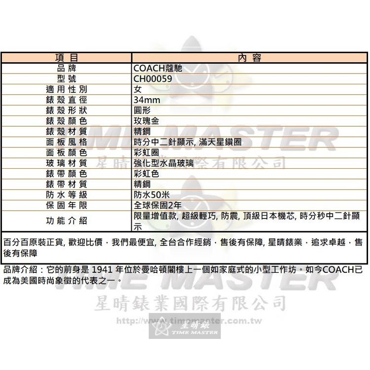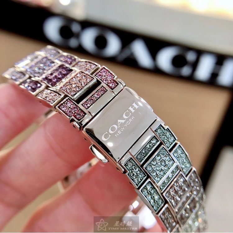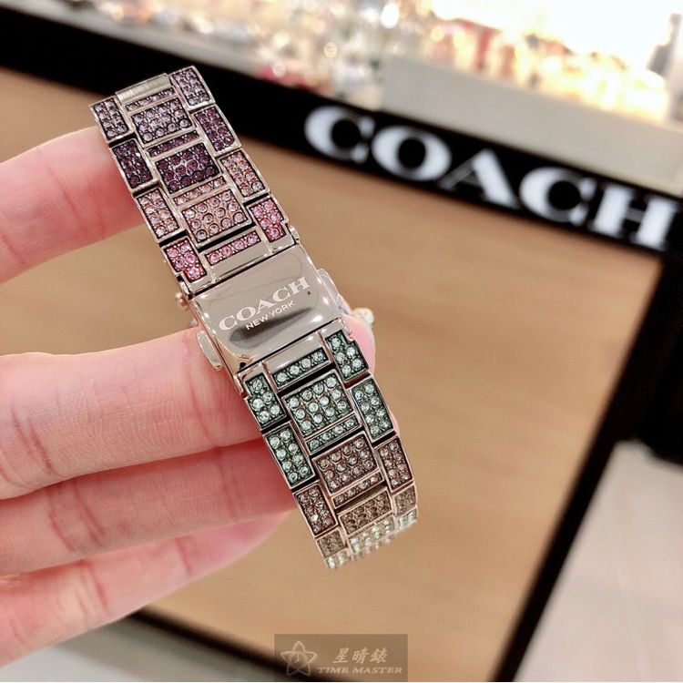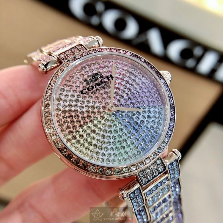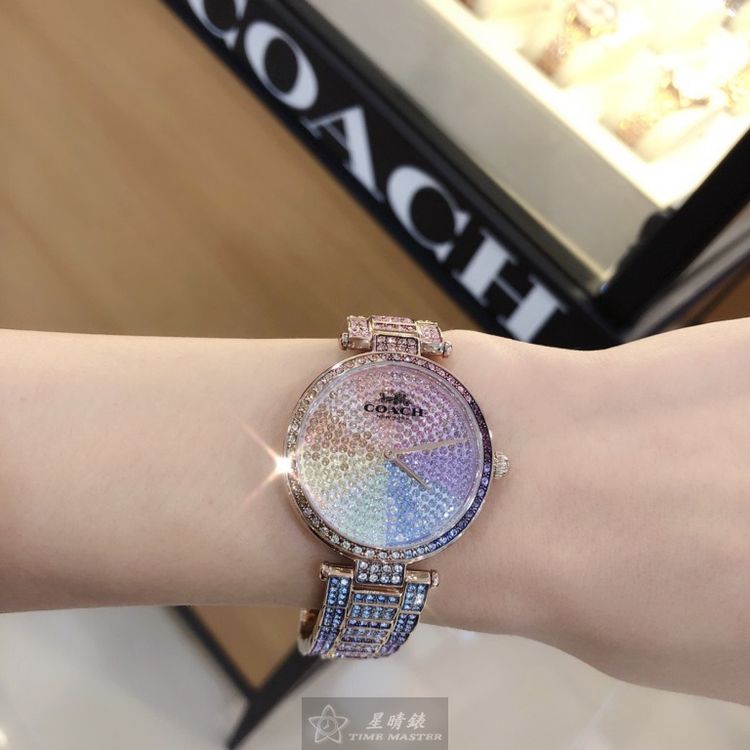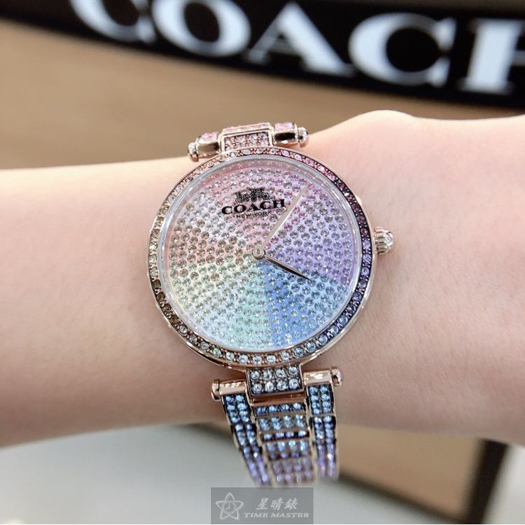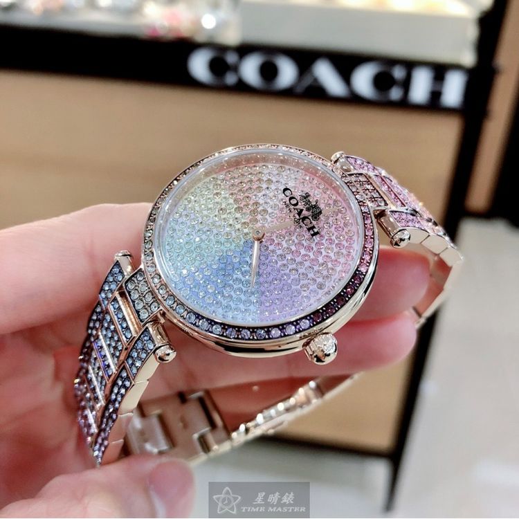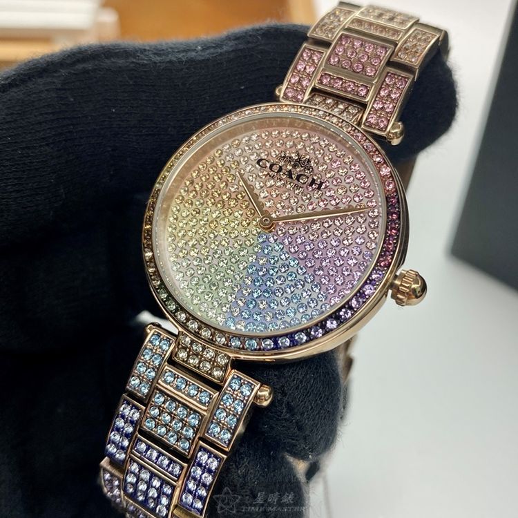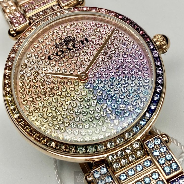 COACH手錶,編號CH00059,34mm玫瑰金圓形精鋼錶殼,彩虹圈時分中二針顯示, 滿天星鑽圈錶面,彩虹色精鋼錶帶款