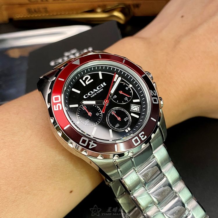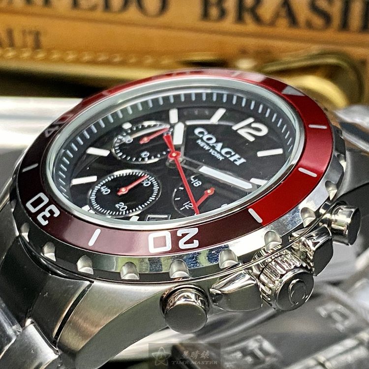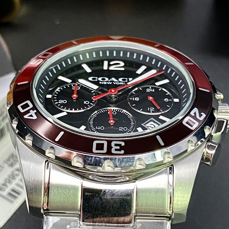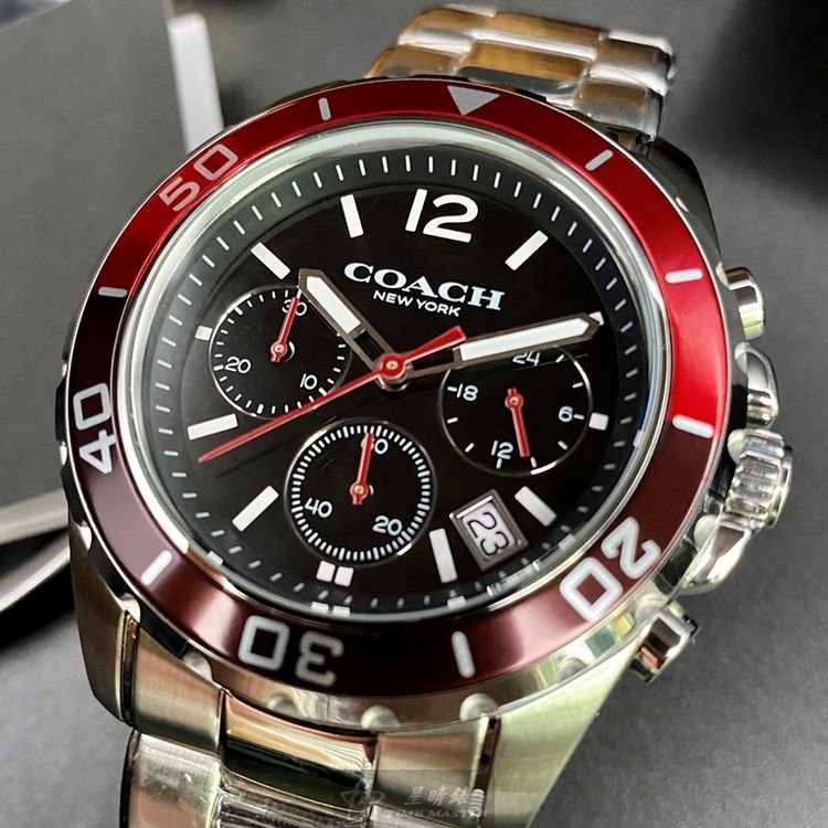 COACH手錶,編號CH00062,44mm紅黑色圓形精鋼錶殼,黑色三眼, 時分秒中三針顯示, 水鬼錶面,銀色精鋼錶帶款-[置頂推薦]