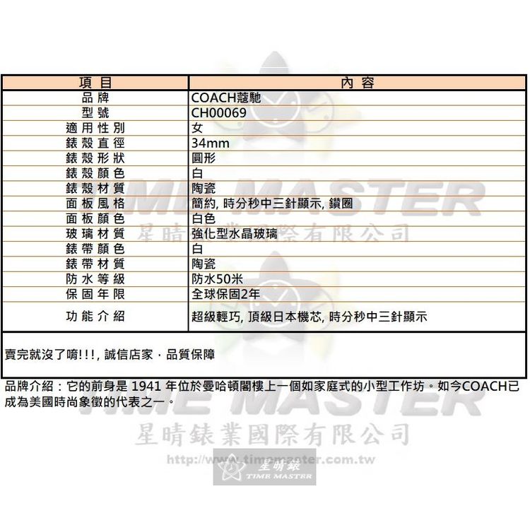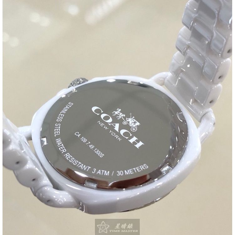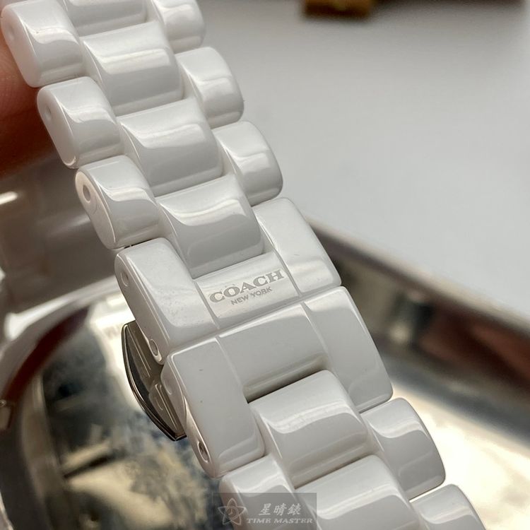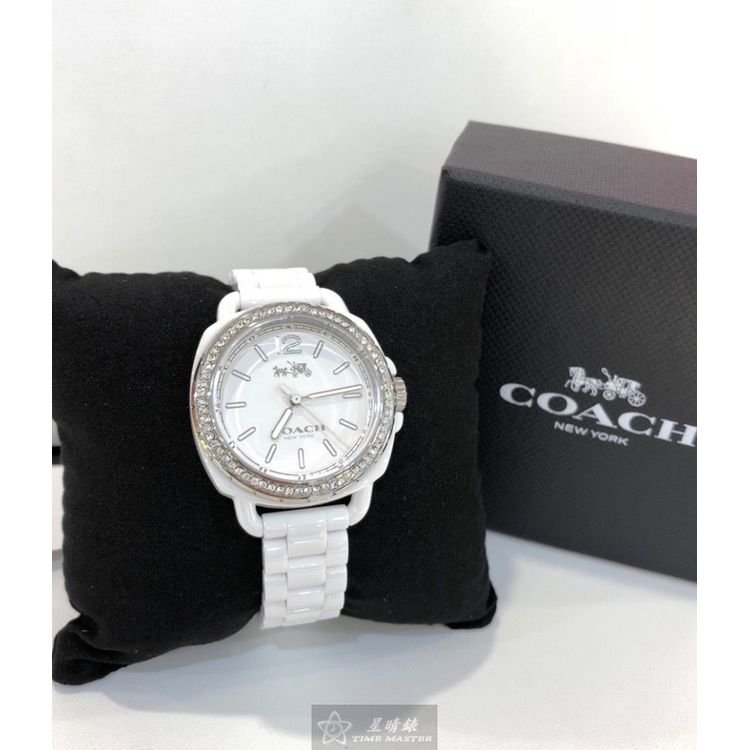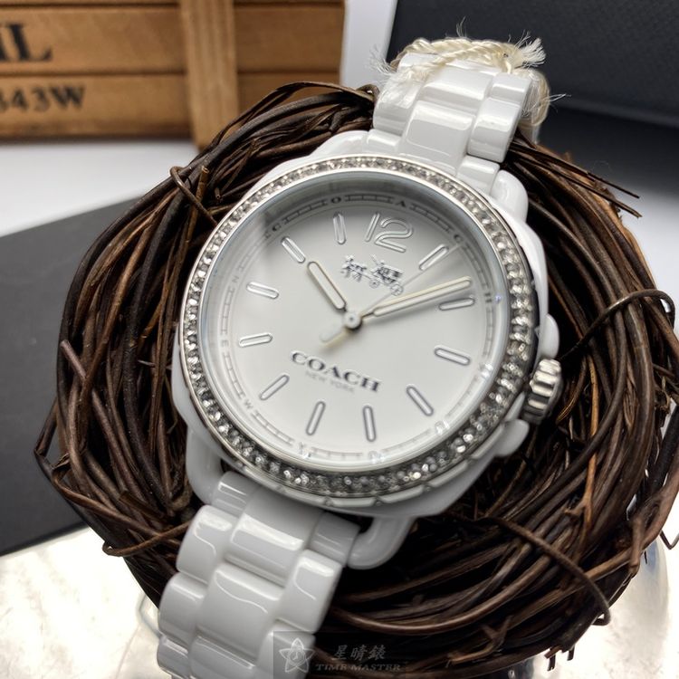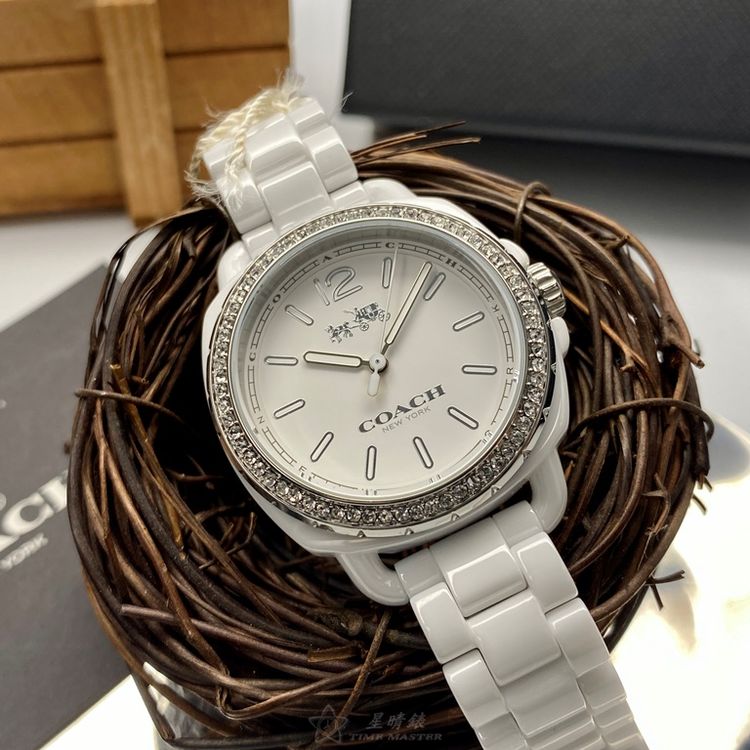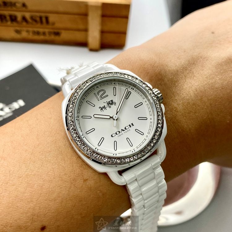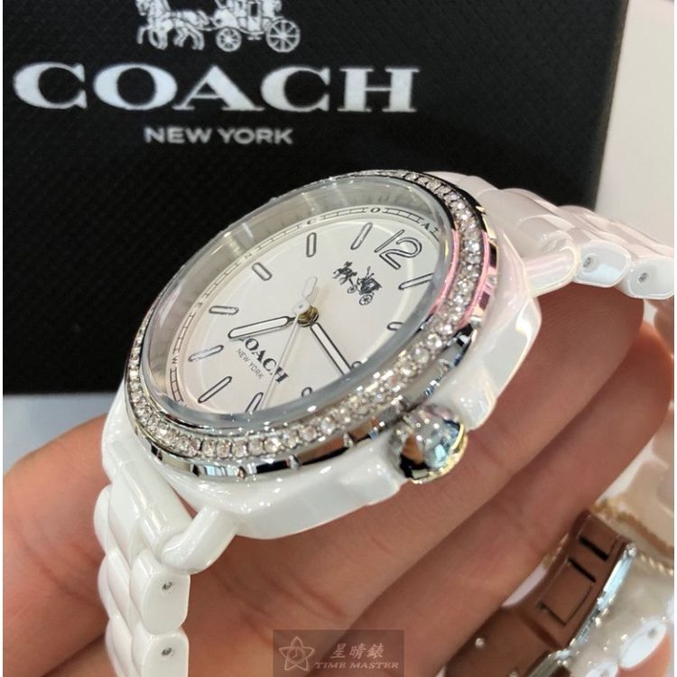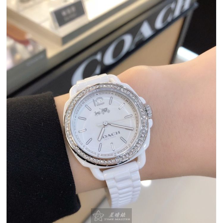 COACH手錶,編號CH00069,34mm白圓形陶瓷錶殼,白色簡約, 時分秒中三針顯示, 鑽圈錶面,白陶瓷錶帶款