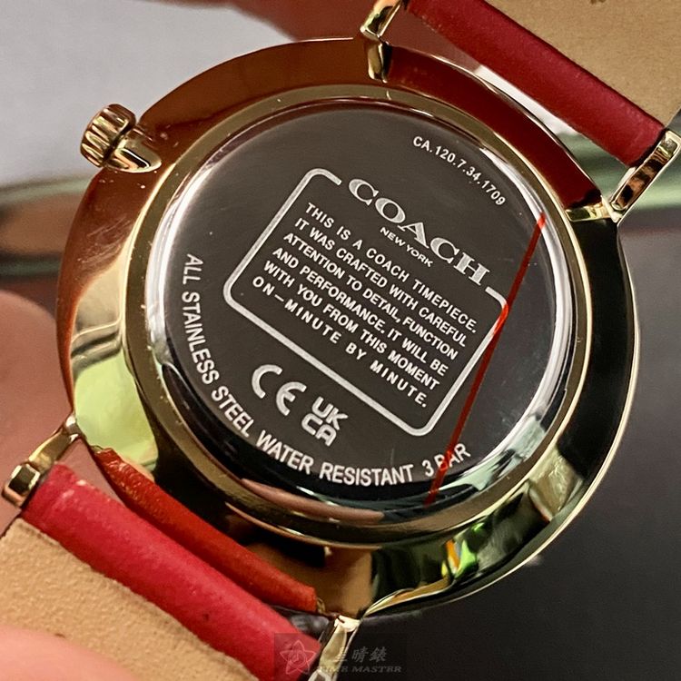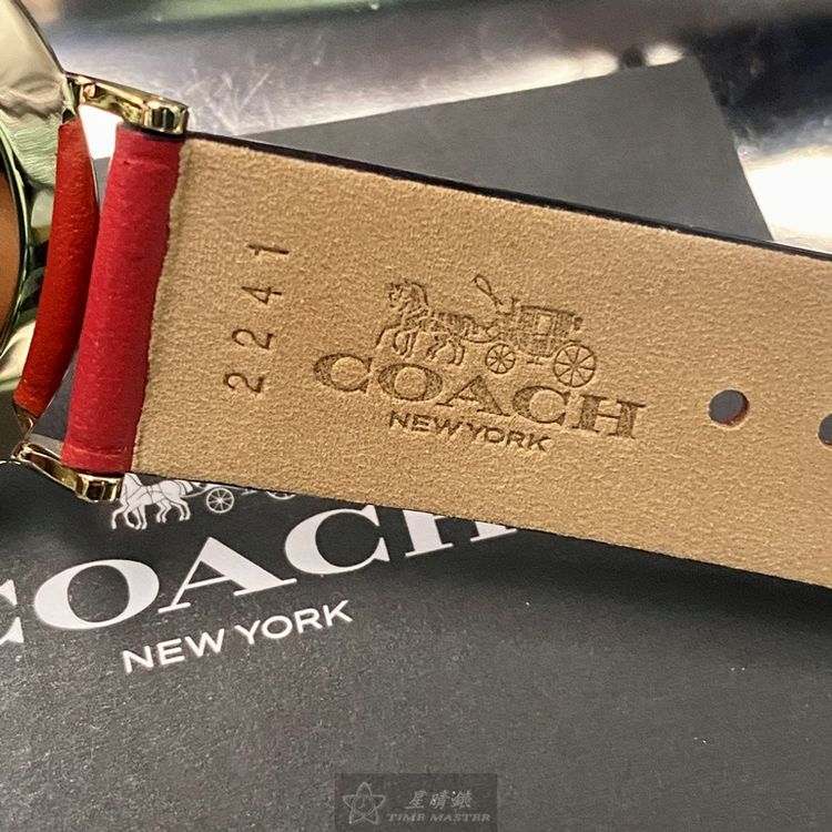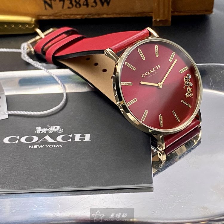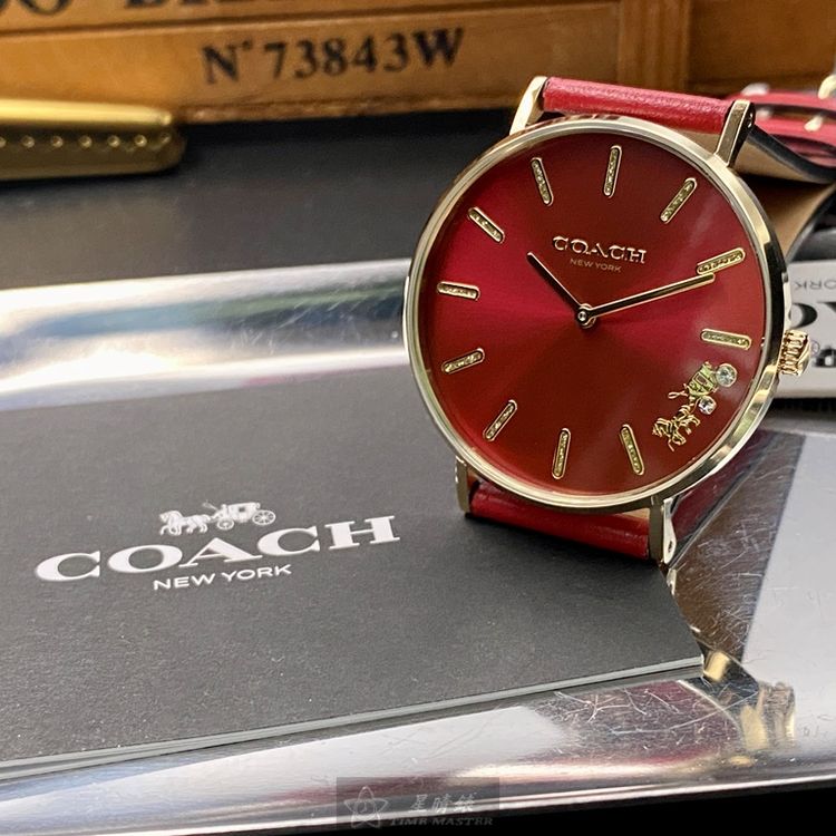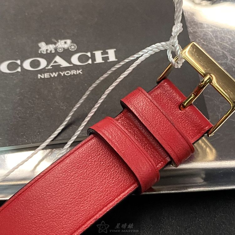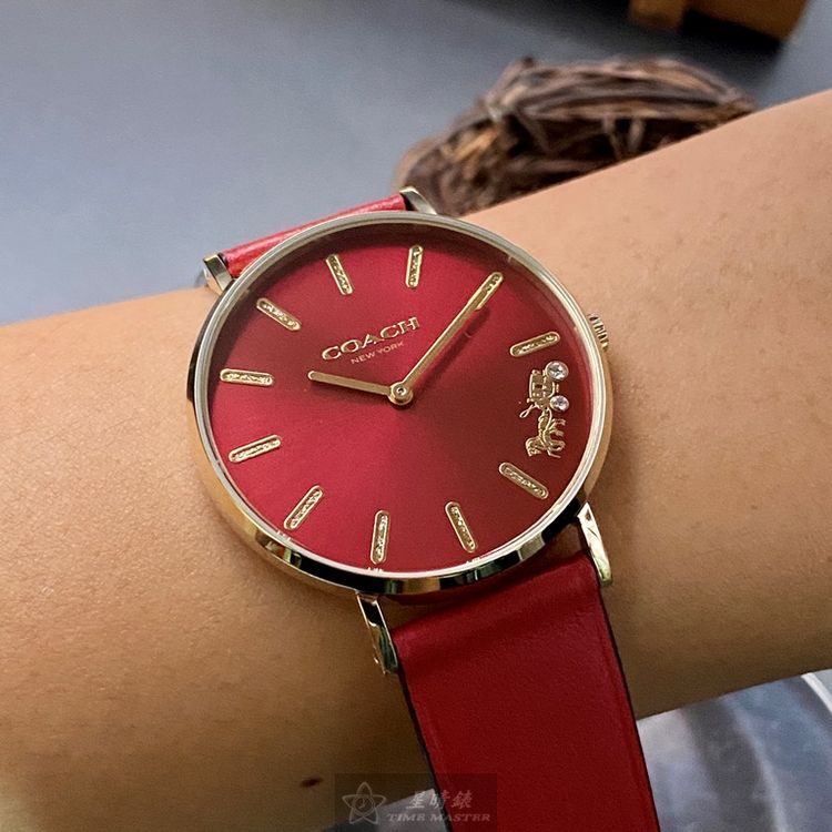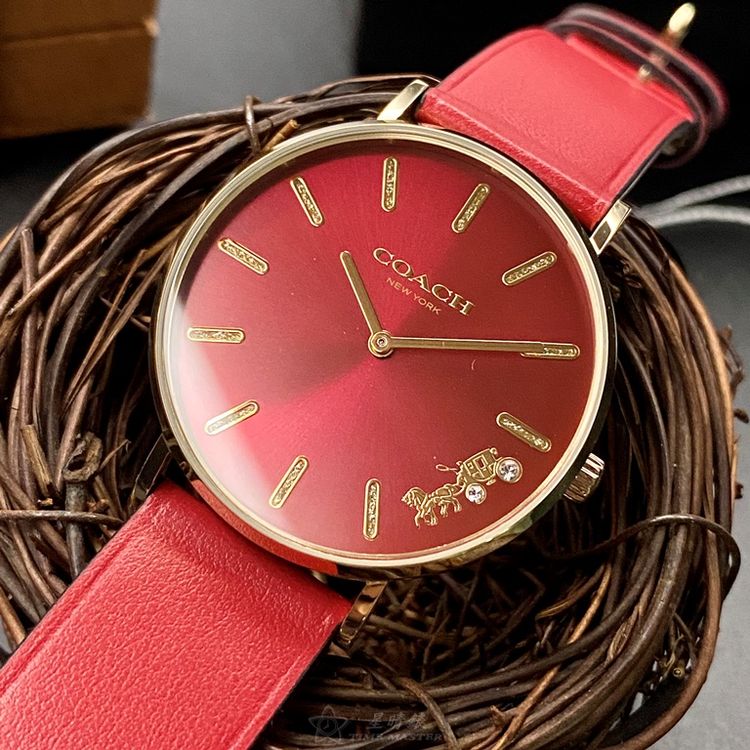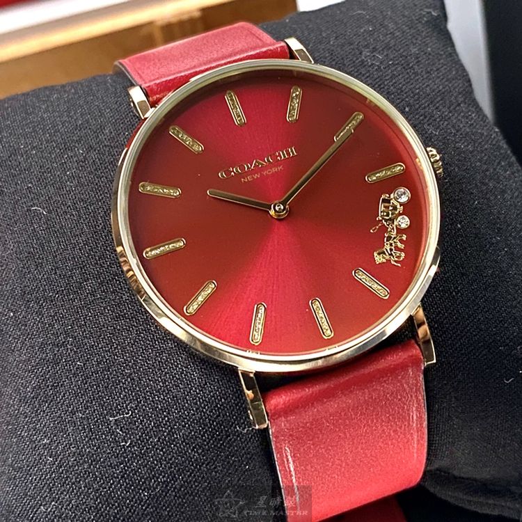COACH手錶,編號CH00116,36mm玫瑰金圓形精鋼錶殼,大紅色簡約, 中二針顯示錶面,大紅真皮皮革錶帶款