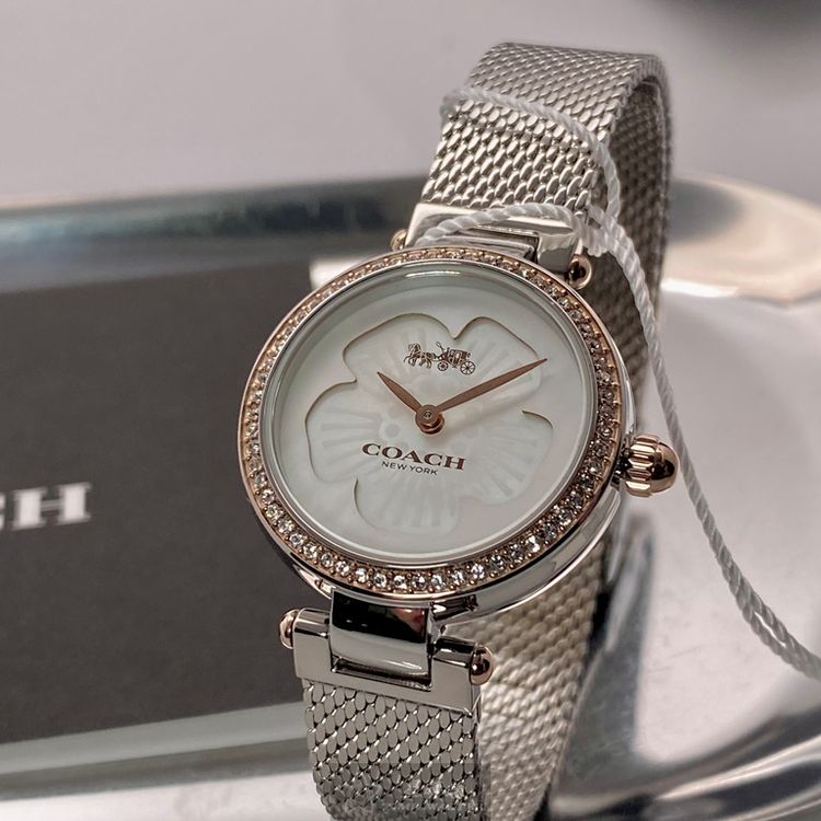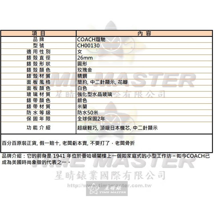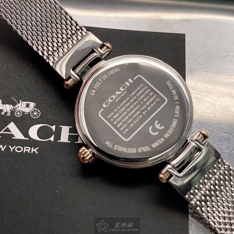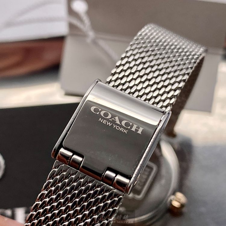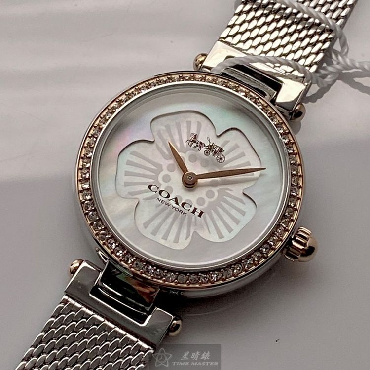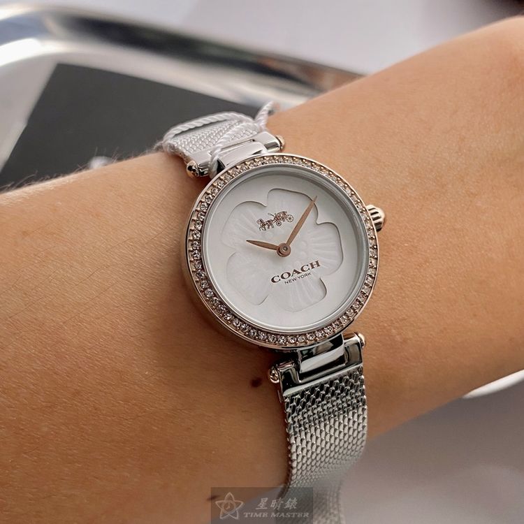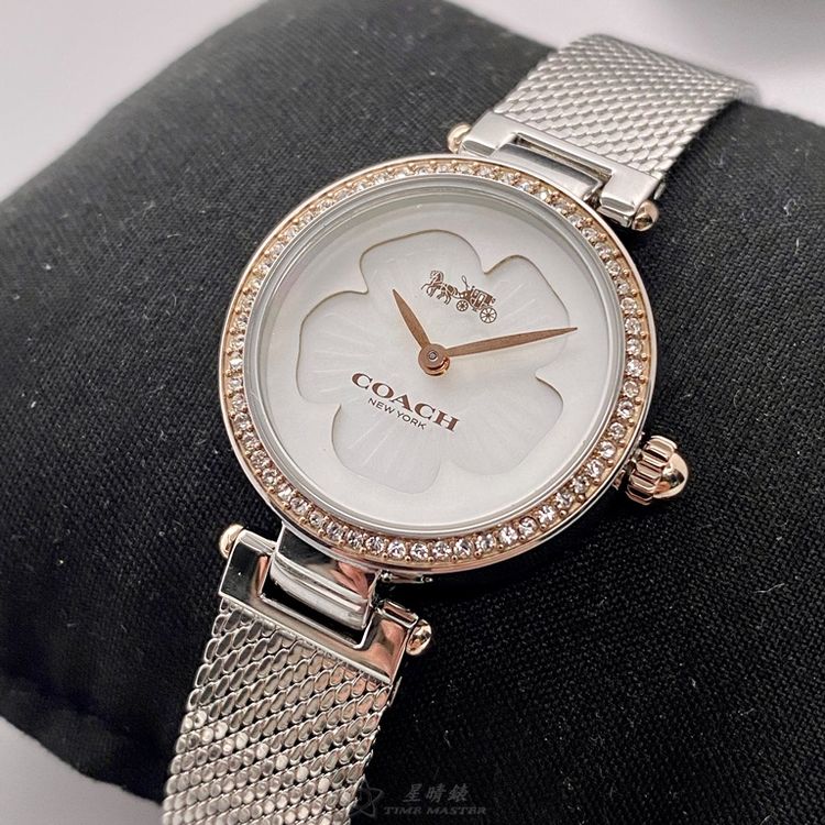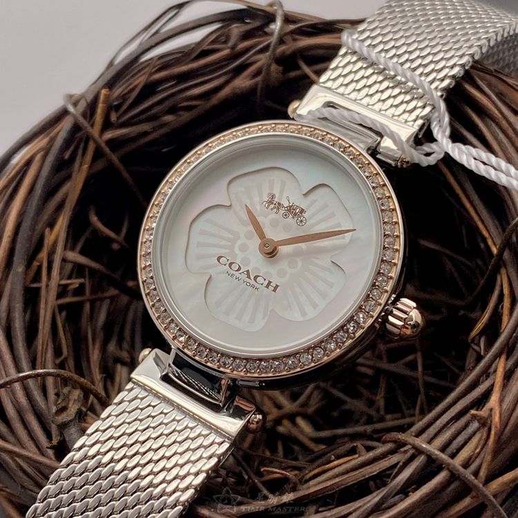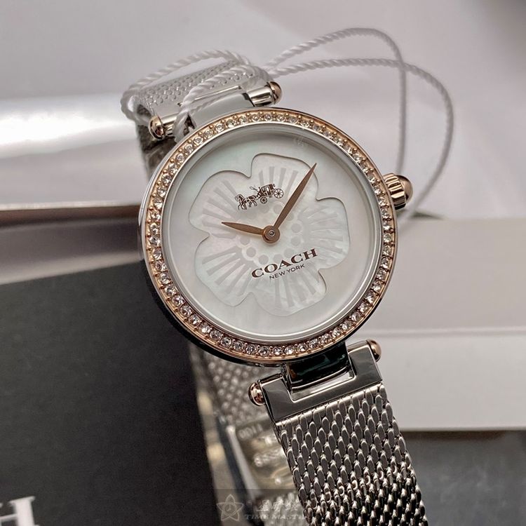 COACH手錶,編號CH00130,26mm玫瑰金圓形精鋼錶殼,白色簡約, 中二針顯示, 花瓣錶面,銀色米蘭錶帶款