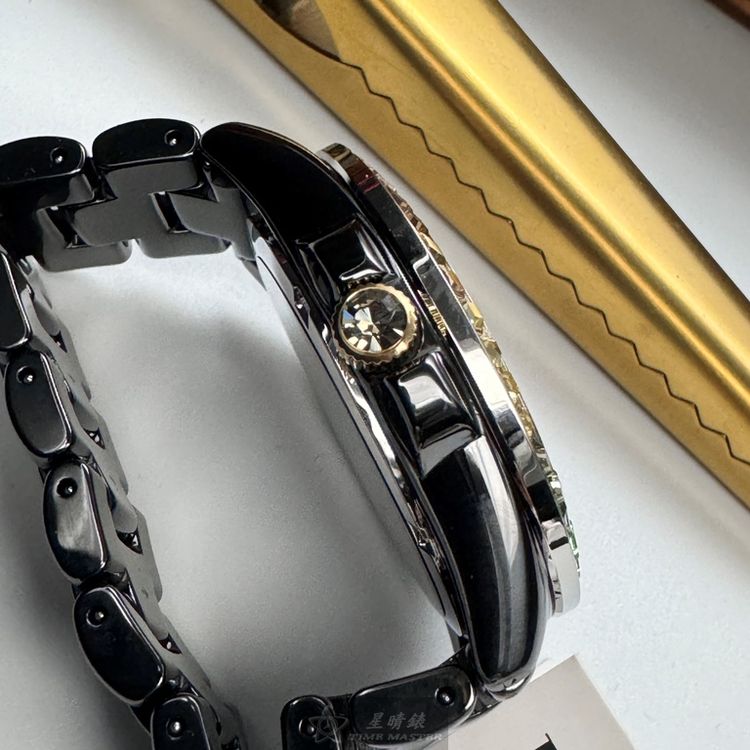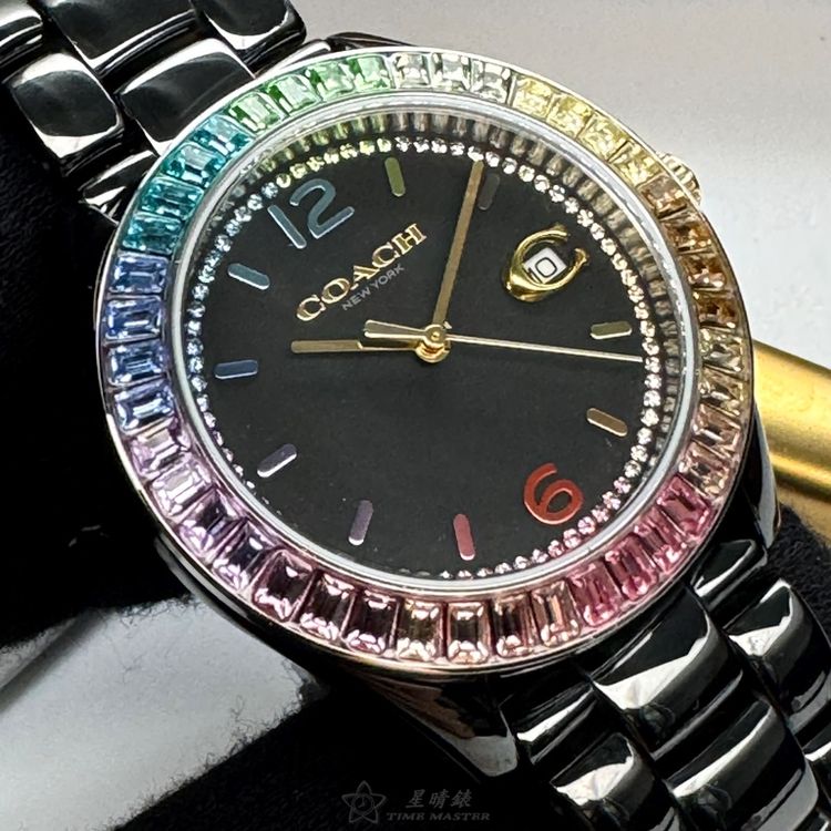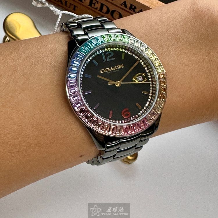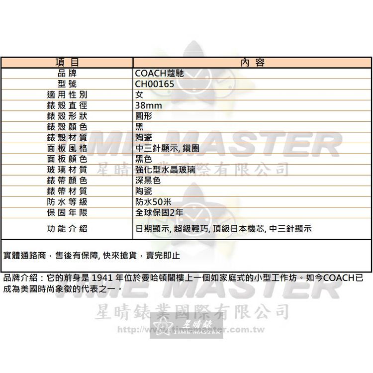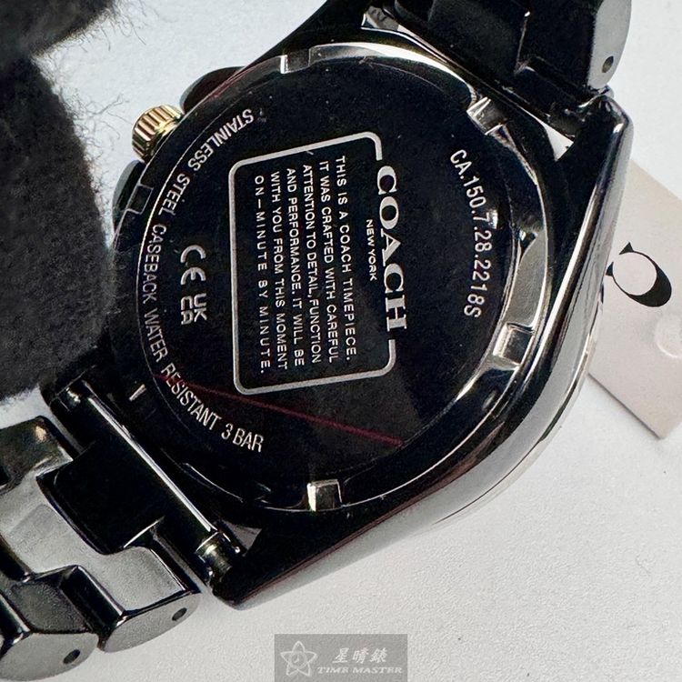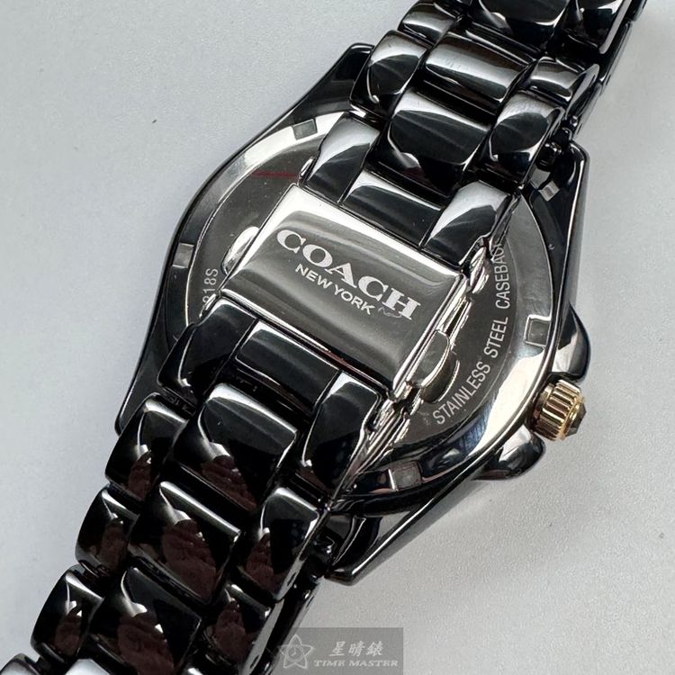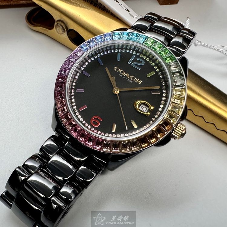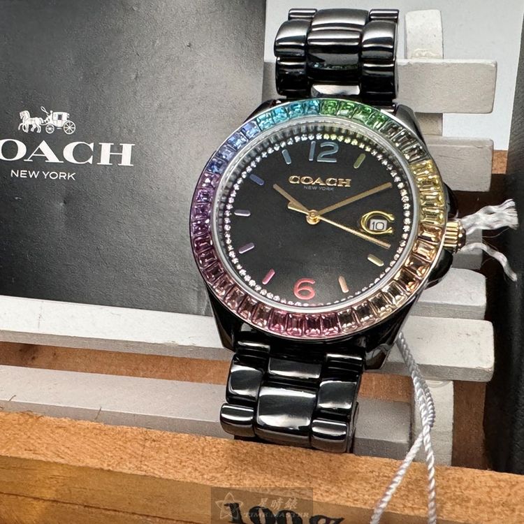 COACH手錶,編號CH00165,38mm黑圓形陶瓷錶殼,黑色中三針顯示, 鑽圈錶面,深黑色陶瓷錶帶款