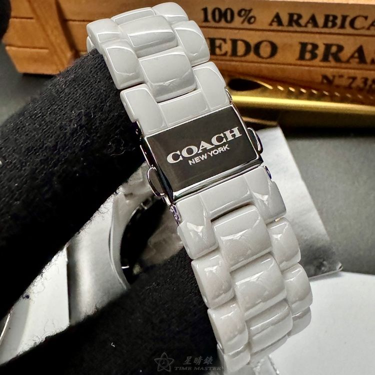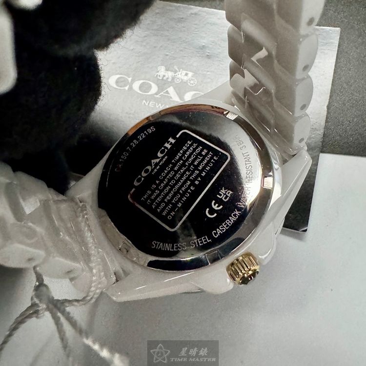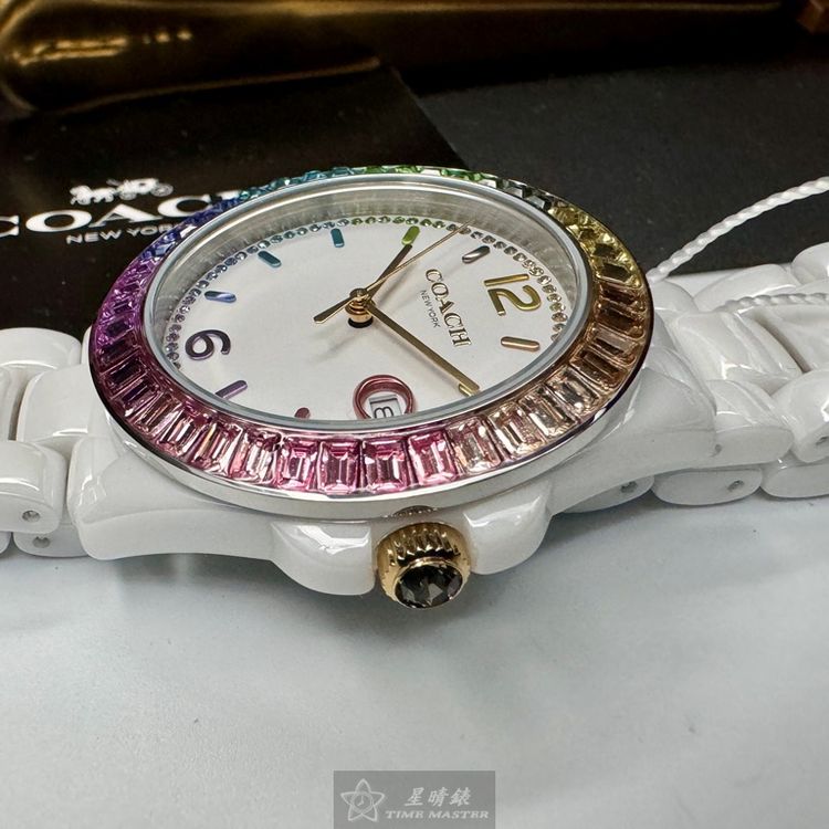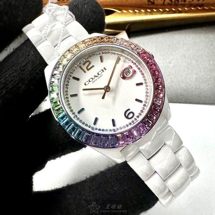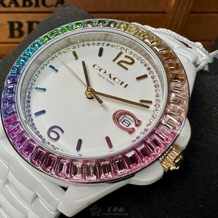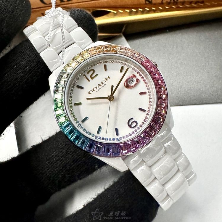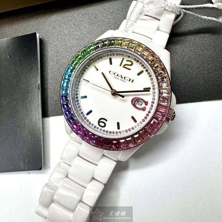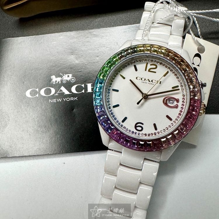 COACH手錶,編號CH00167,38mm白圓形陶瓷錶殼,白色中三針顯示, 鑽圈錶面,白陶瓷錶帶款,限量彩虹鑽圈-[置頂推薦]
