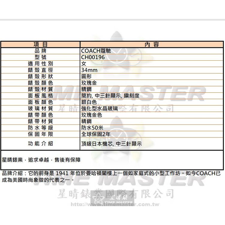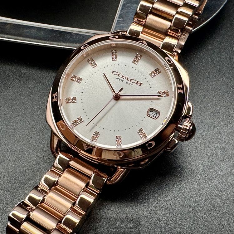 COACH手錶,編號CH00196,34mm玫瑰金錶殼,玫瑰金色錶帶款