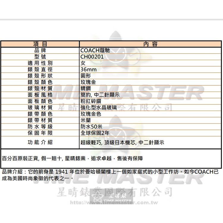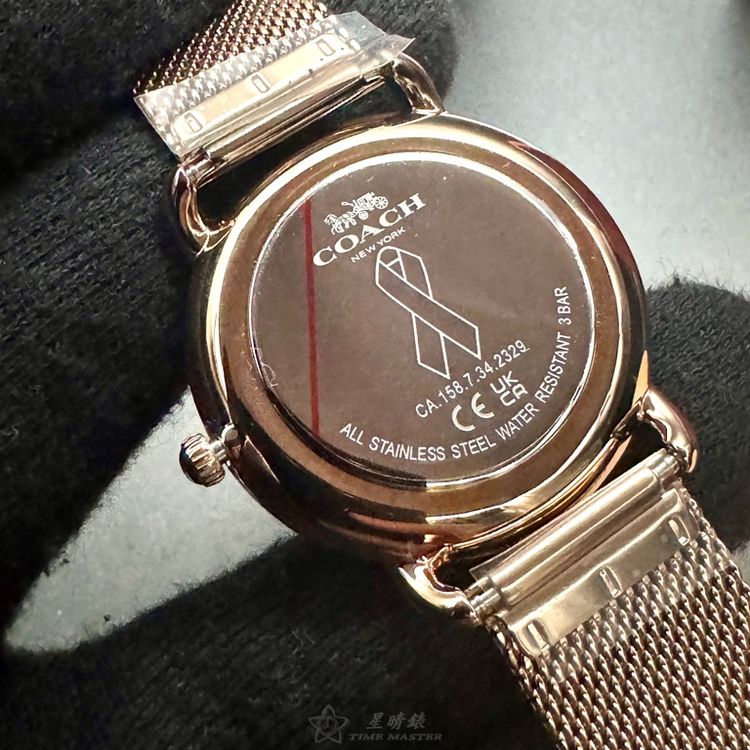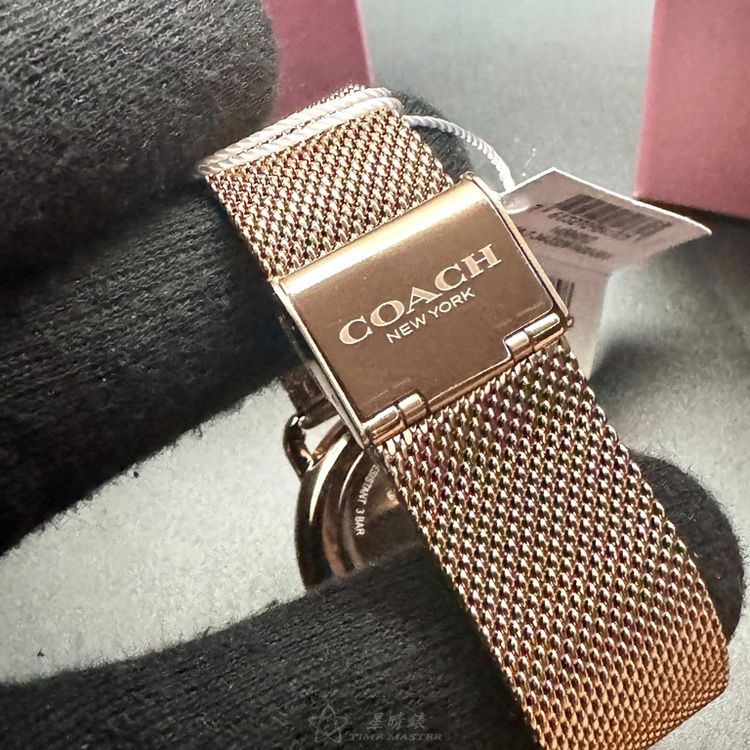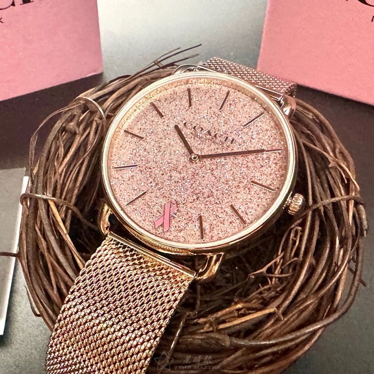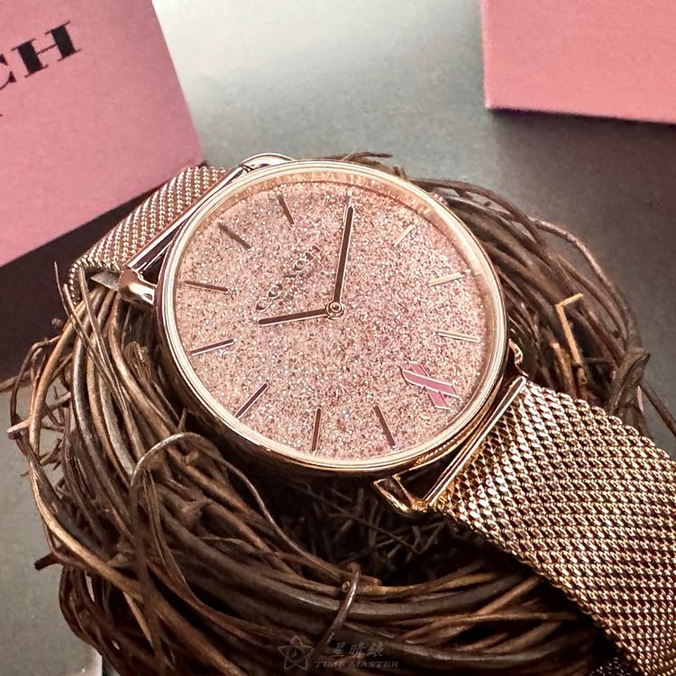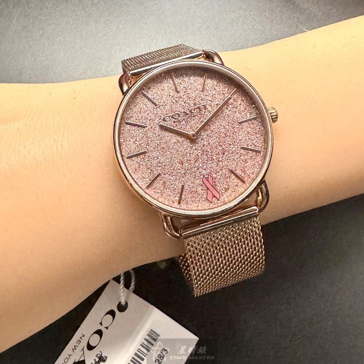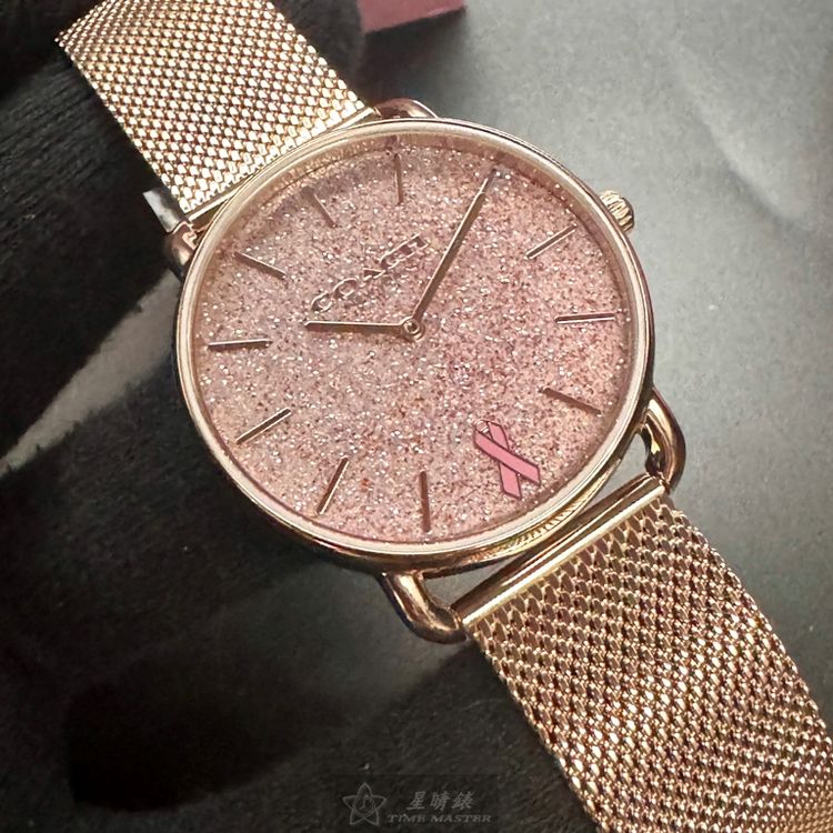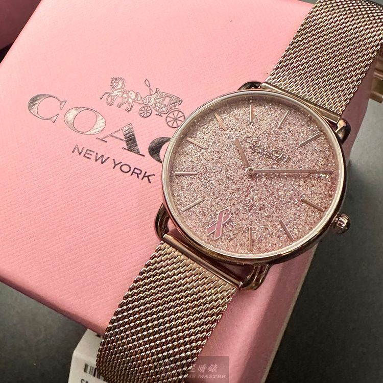 COACH手錶,編號CH00201,36mm玫瑰金圓形精鋼錶殼,粉紅碎鑽簡約, 中二針顯示錶面,玫瑰金色米蘭錶帶款