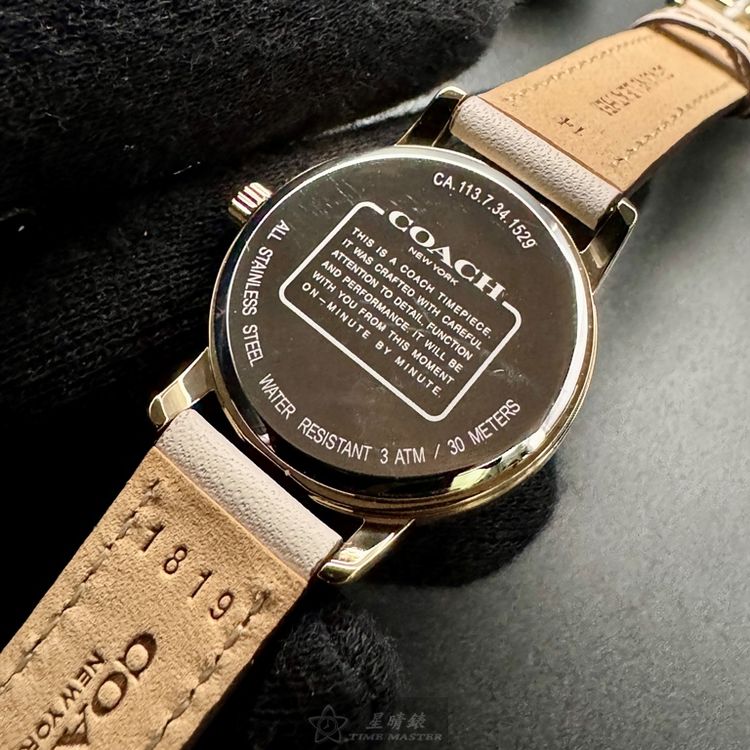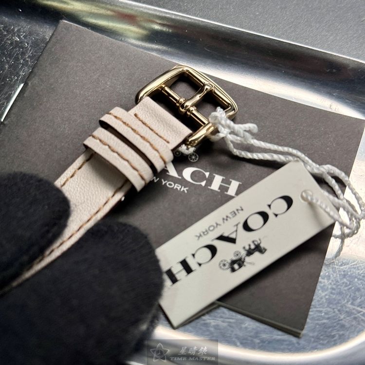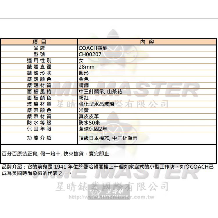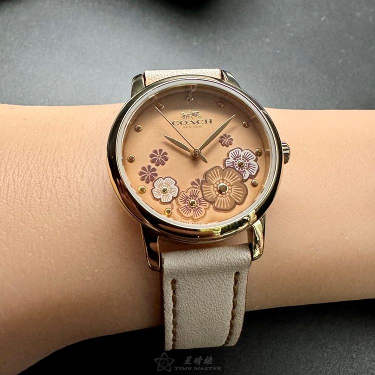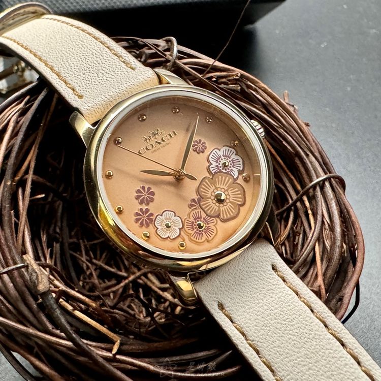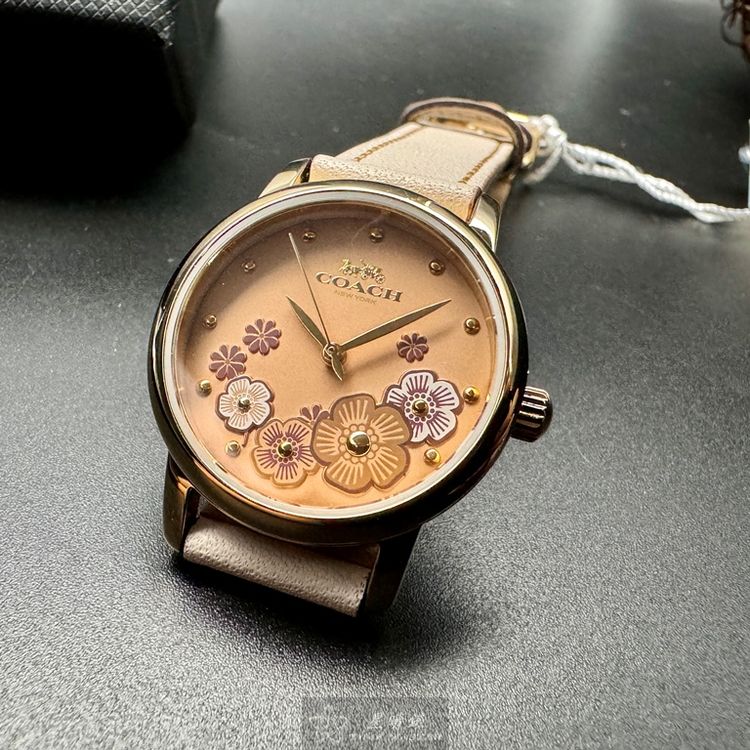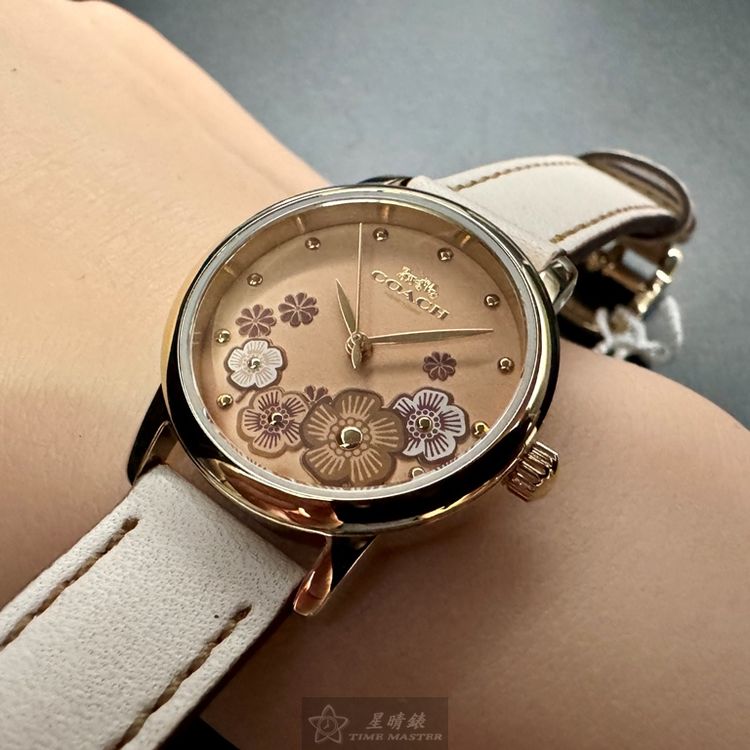 COACH手錶,編號CH00207,28mm金色圓形精鋼錶殼,粉紅中三針顯示, 山茶花錶面,米黃真皮皮革錶帶款