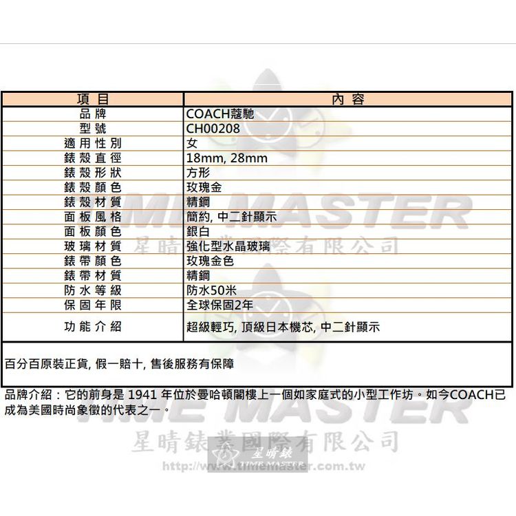 COACH手錶,編號CH00208,18mm, 28mm玫瑰金錶殼,玫瑰金色錶帶款