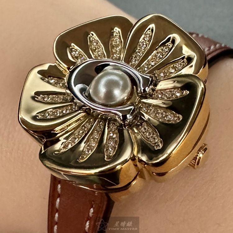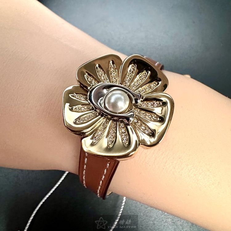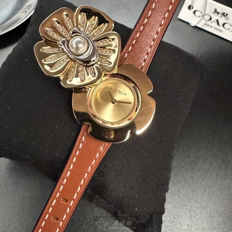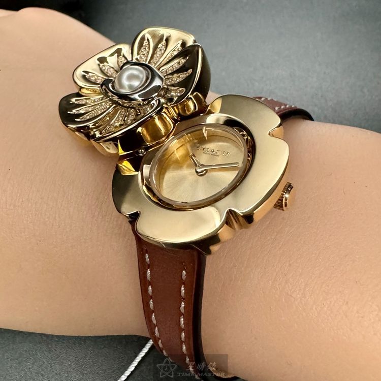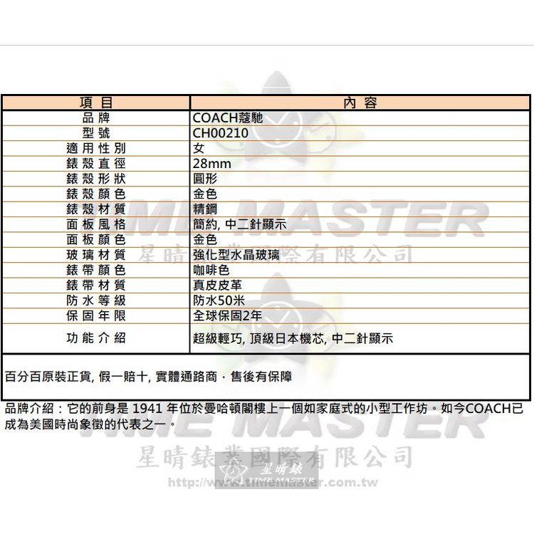 COACH手錶,編號CH00210,28mm金色圓形精鋼錶殼,金色簡約, 中二針顯示錶面,咖啡色真皮皮革錶帶款